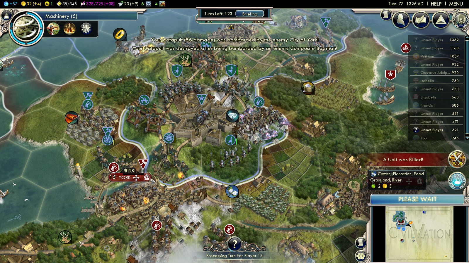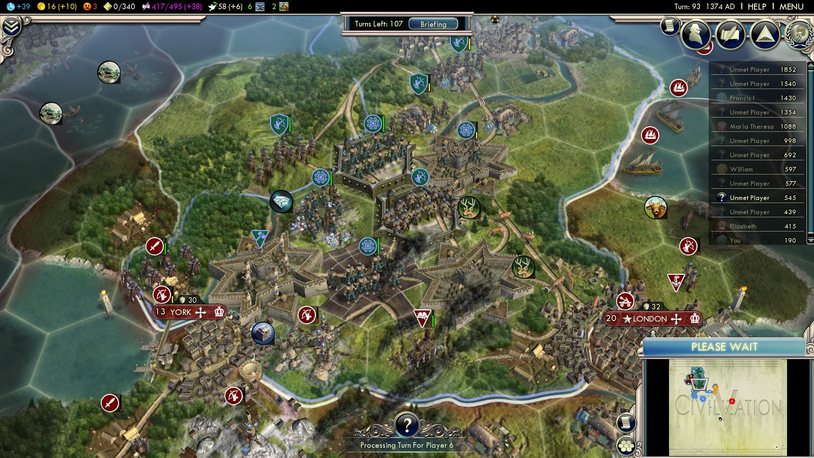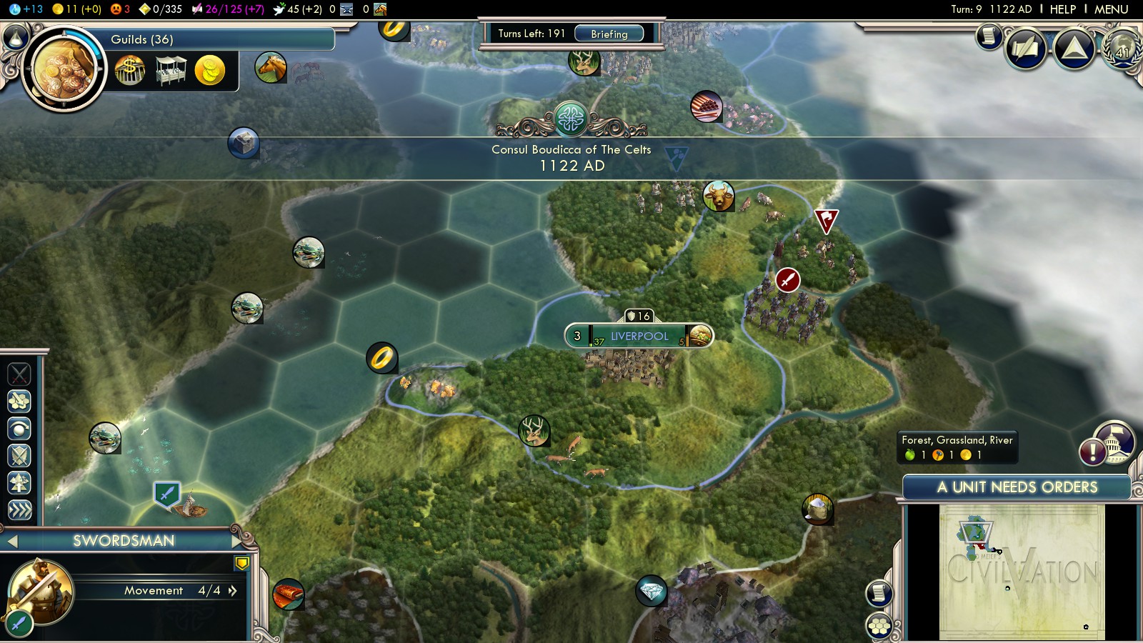 Here’s the short history of my 2 Deity attempts: To weaken England early, before they can amass loads of units, I founded Newcastle and declared war on England in turn 10 already. Fighting off the initial attack (they already start with several Swordsmen and three (!!!) catapults), I garrisoned the forest hills in middle England. Not killing enough units, they overwhelmed me in turn 40.