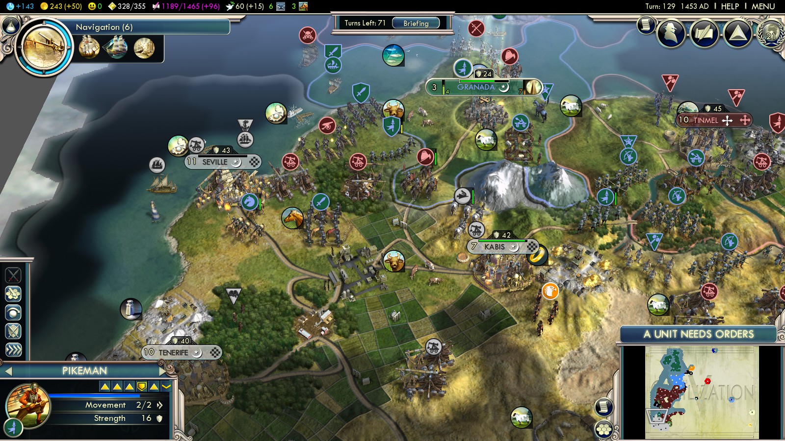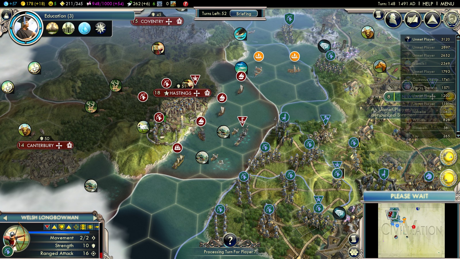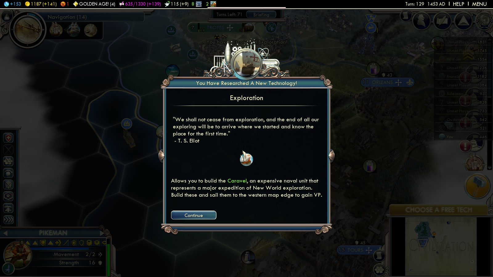 - Compass (turn 109) – by now you should have all your Universities and set all cities to Science focus. A research agreement back from turn 78 (with the Netherlands) finished in 103, helping to research Compass in only 8 turns. So don’t waste the money from your England-conquest – invest it wisely!