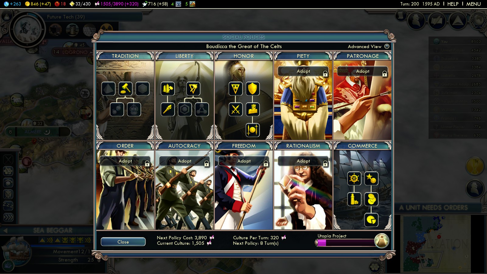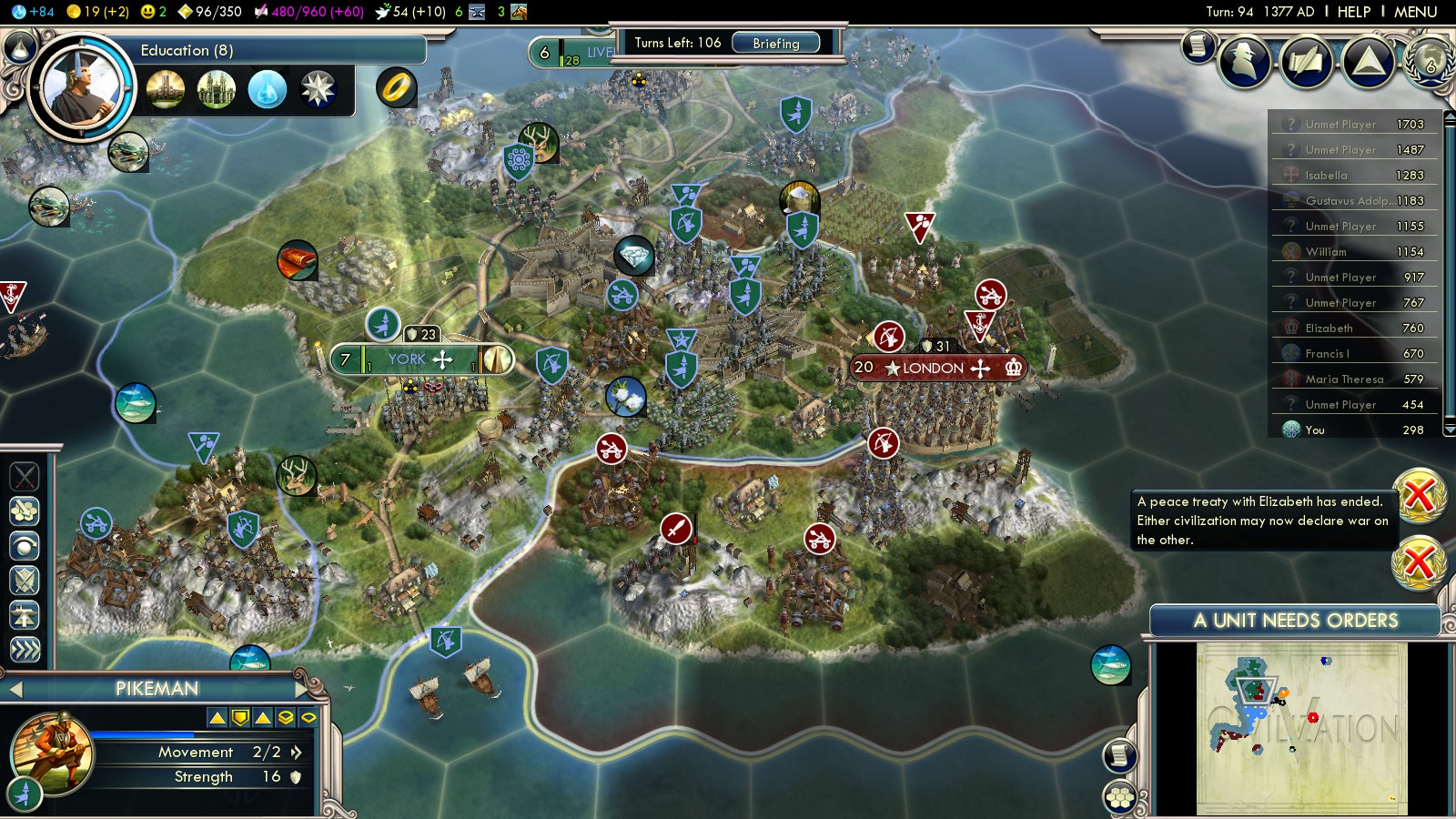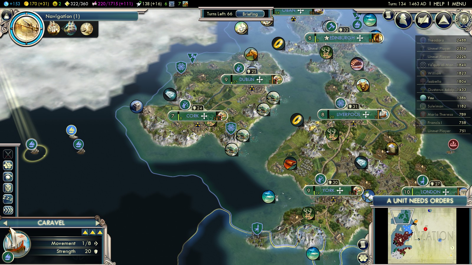 - Compass (turn 109) – by now you should have all your Universities and set all cities to Science focus. A research agreement back from turn 78 (with the Netherlands) finished in 103, helping to research Compass in only 8 turns. So don’t waste the money from your England-conquest – invest it wisely!