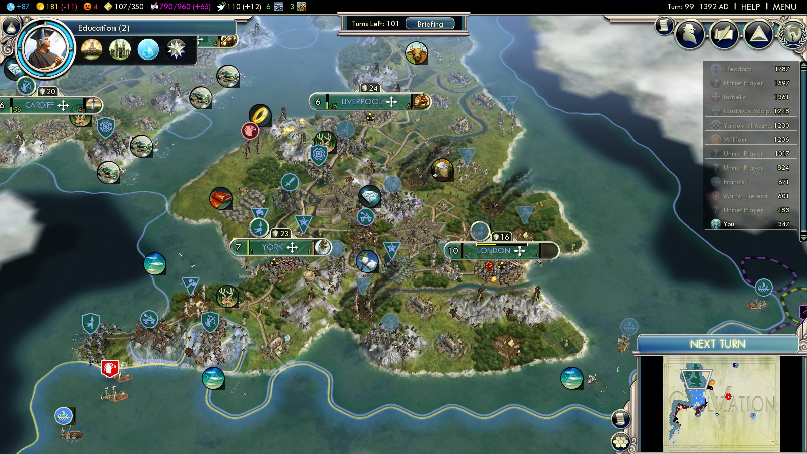Once the war against England goes reasonably well, you’ll need to build Libraries in all your cities ASAP! The libraries actually aren’t the important thing itself – building the National College in Edinburgh is! So time your libraries well – no reason to have it in one city, while the others lack behind 15 turns. Here’s my Research order and the turns I got those techs:
