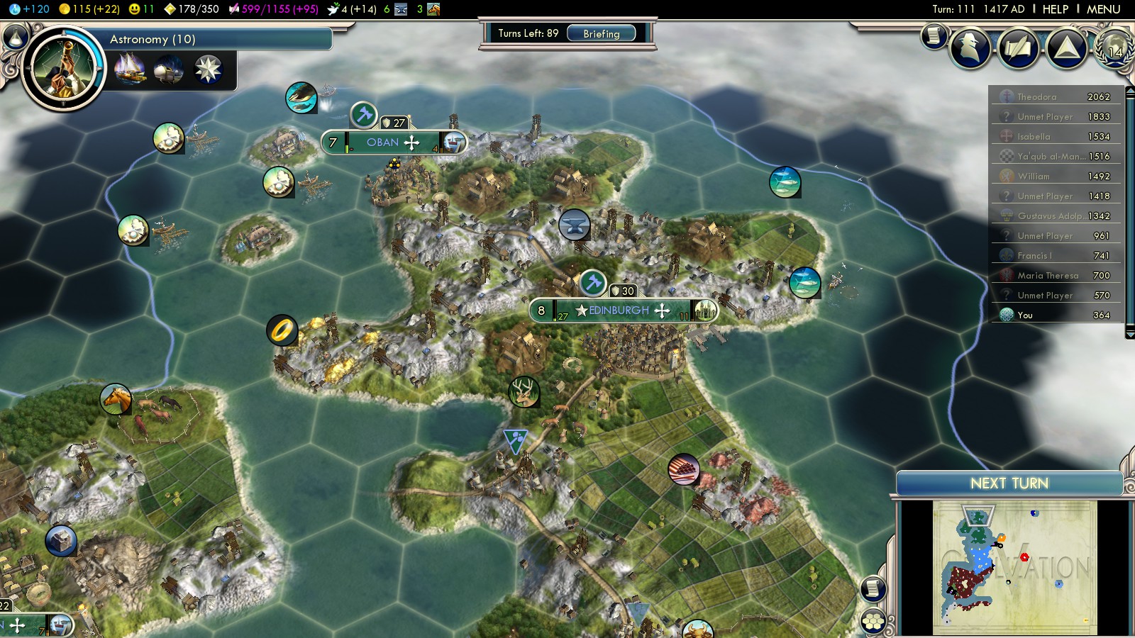 - Astronomy (turn 120) – Once you start researching Astronomy – start building University of Oxford. But DO NOT finish it before finishing Astronomy! Ideally it should finish the very next turn, so you can choose: