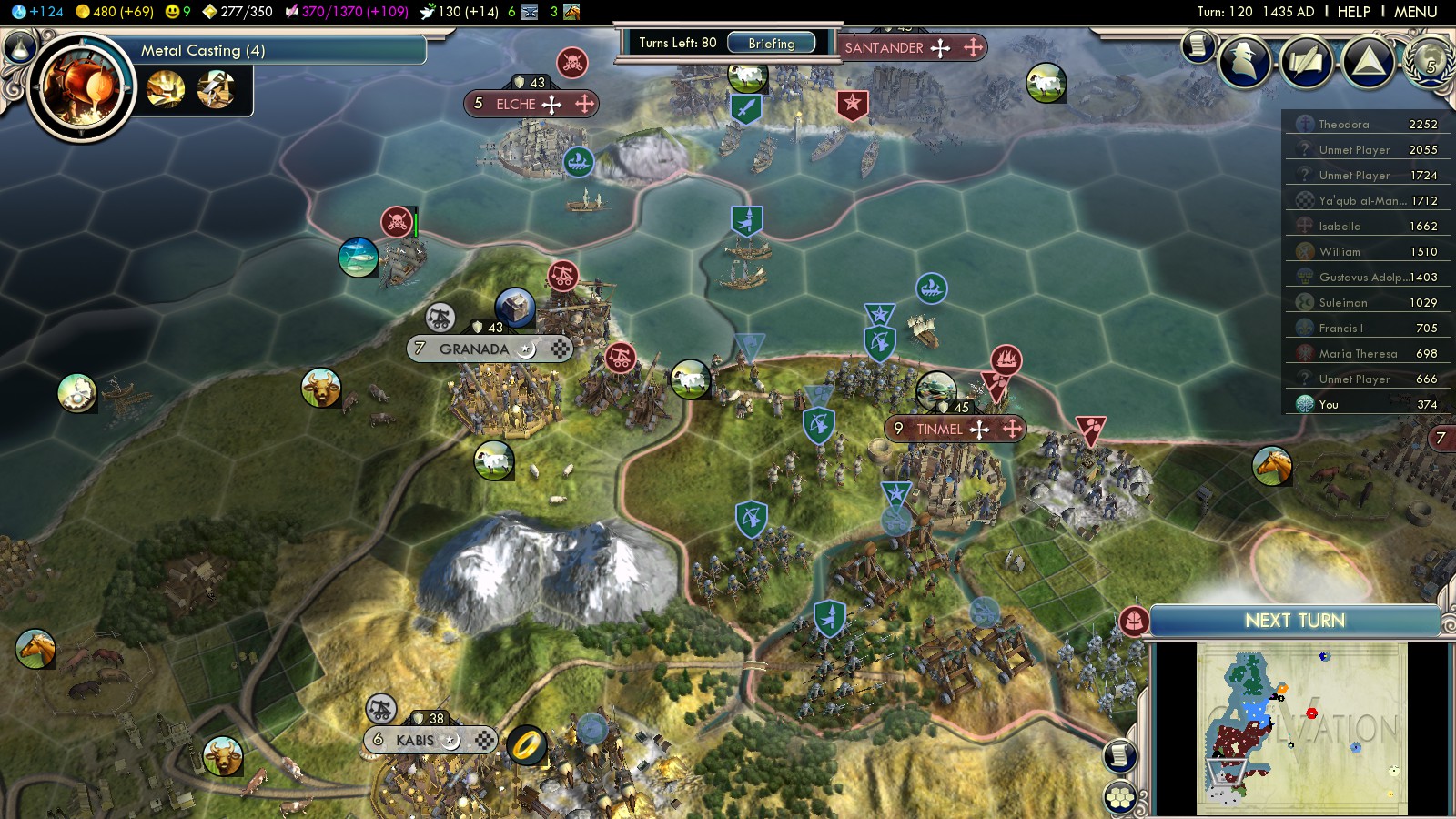 Until Marrakech, the Almohad cities gave me an overall 1325 VP so far. That was only in turn 157. So there were plenty of turns left in which I advanced further into the heart of Almohad Northern Africa. Without any further naval conquest by Spain, they were no competition anymore.