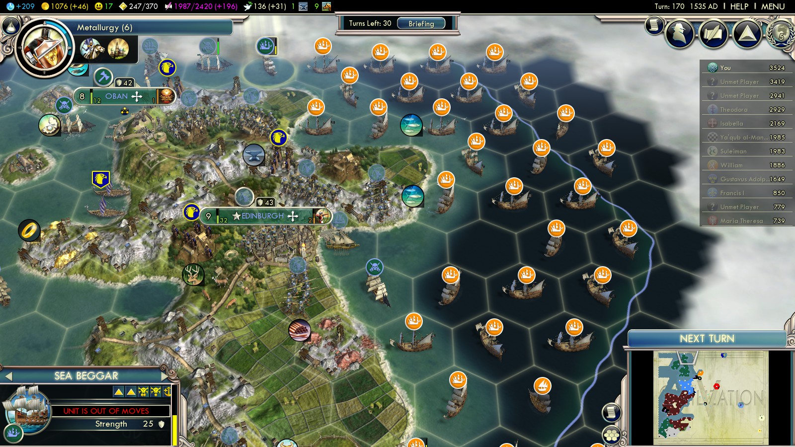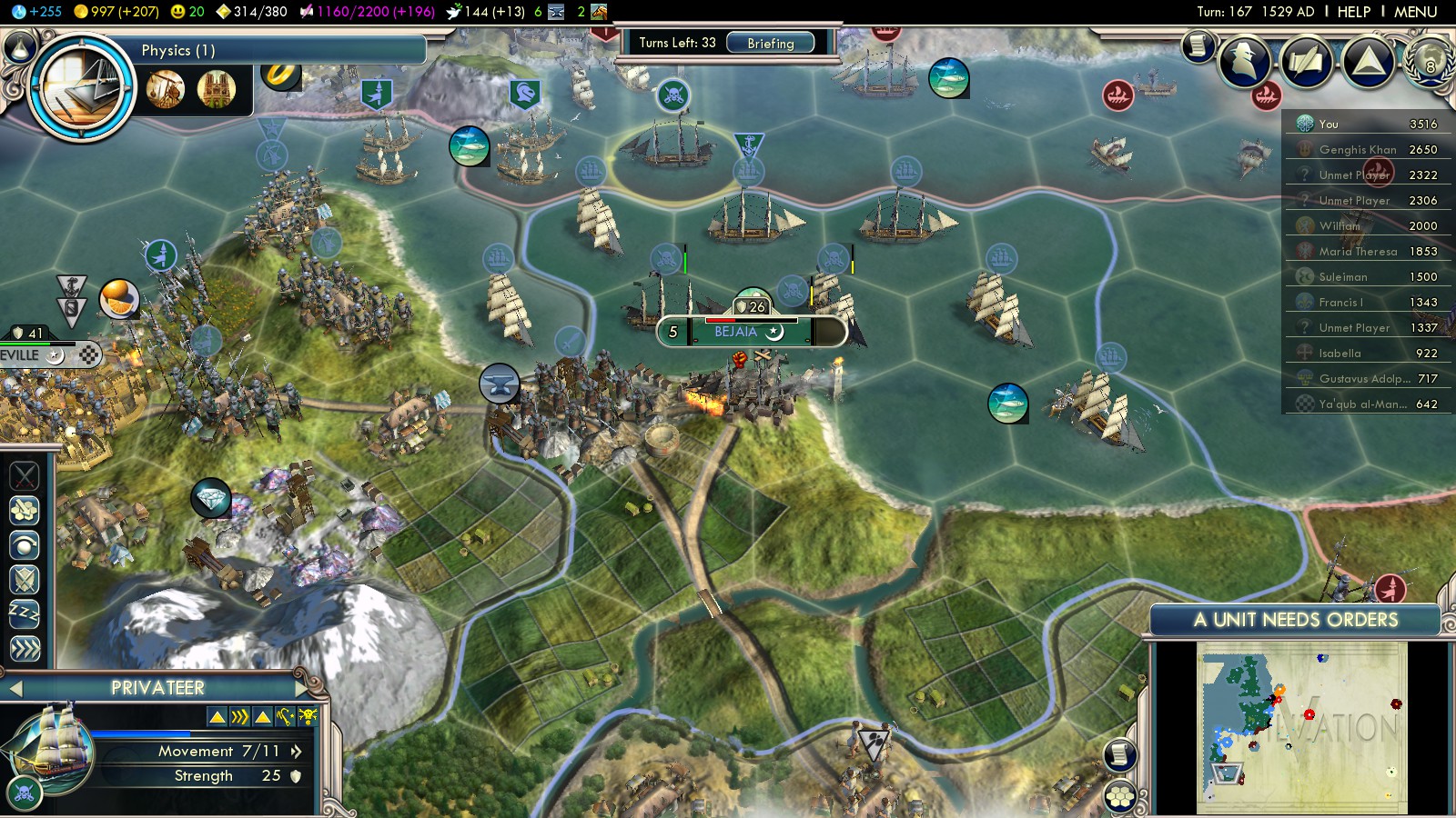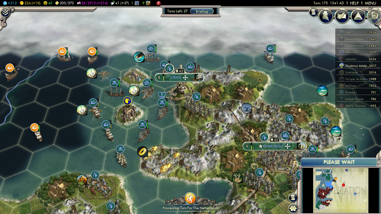 In turn 147 I signed an Open Borders treaty with the Netherlands. Over the next 10 turns they started moving dozens of units into the Atlantic Ocean and amassed a giant fleet right at my coast. I got scared, so I built some more Longbowmen and Privateers, to protect my cities. I forgot who declared war, but eventually we went to war in turn 169. The next turns took hours with me capturing as many Dutch ships as possible: