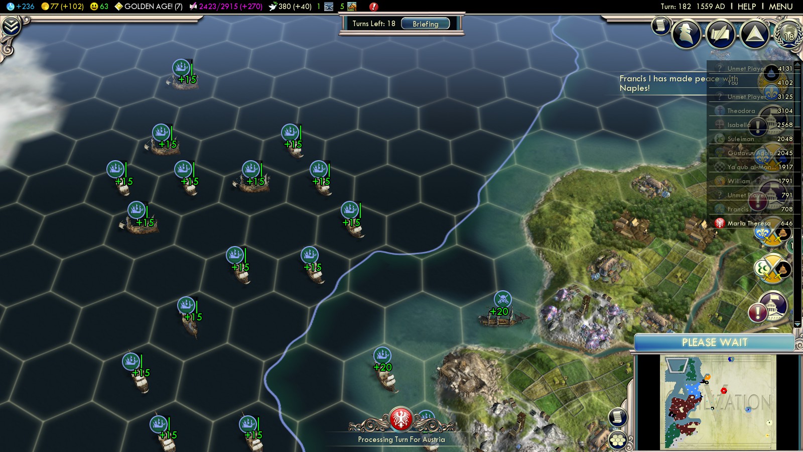 I was surprised to already see a French Caravel on the Atlantic Ocean. France didn’t score though, so it seems the AI uses Caravels solely to explore and then “accidentally” scores. This is quite likely for Spain and France, since they will explore the unknown area between Spain and the border of the map.