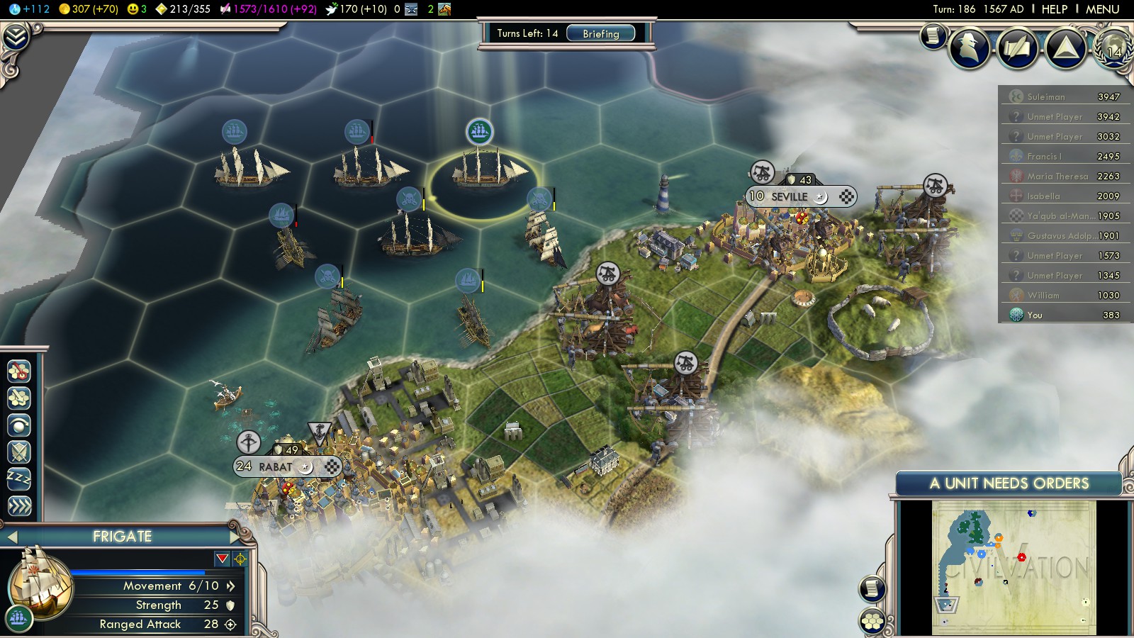 Taking the (French!) coastal cities in Spain and Portugal, Lisbon (Muslim) fell in turn 165. After that I turned on the Almohads, capturing their coastal cities in turn 167, 169, 170. It was a long way until Marrakech (189) and by then my fleet had captured Italy more out of boredom than necessity.