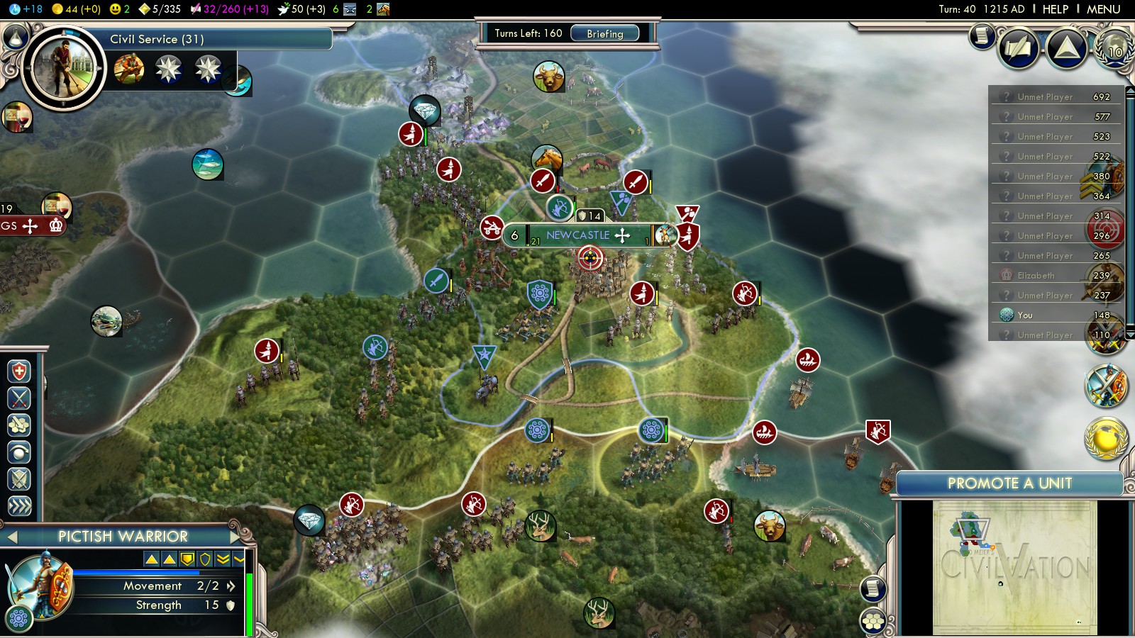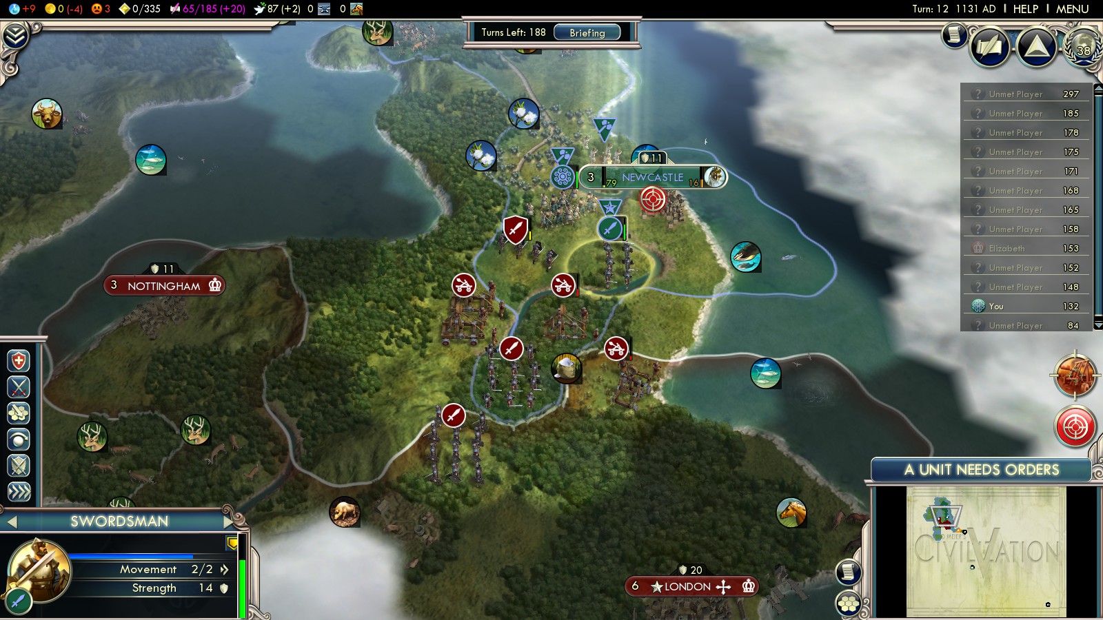 In my second Deity attempt I not only founded Newcastle, but also used the first Great General (from choosing the Honor Social Policy tree) to build a defensive citadel. England will continuously try to conquer and pillage that citadel, but the spot I chose is very defensible. So not only could I fight back all English attempts to march North, but I also chose to build 2 more citadels, advancing deep into England. Constantly killing English units, I first captured York and eventually London in turn 138. Later the Welsh Longbowmen bombarded Ireland, I captured my bridge head there and wiped out England.