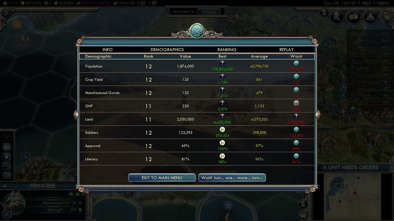 As of the “Messages” tab of the winning/statistics overview this game took me 13 hours, 55 minutes. Of course that doesn’t include loading, saving, a little bit of back and forth here and there. Probably it’s been rather something like 20-24 hours of play time just for the final, successful Deity game. Together with the successful Emperor attempt and two failed Deity attempts this have been about 80 hours play time! By now I can say “Into the Renaissance” is the scenario with the highest depth of gameplay so far! Even better than the Scramble for Africa. 200 turns give you plenty of time to identify with your empire. While the first 50 seem to crawl by, normally they are crucial to later success. 50-150 is mostly build up, while the last 50 turns are purely warfare.