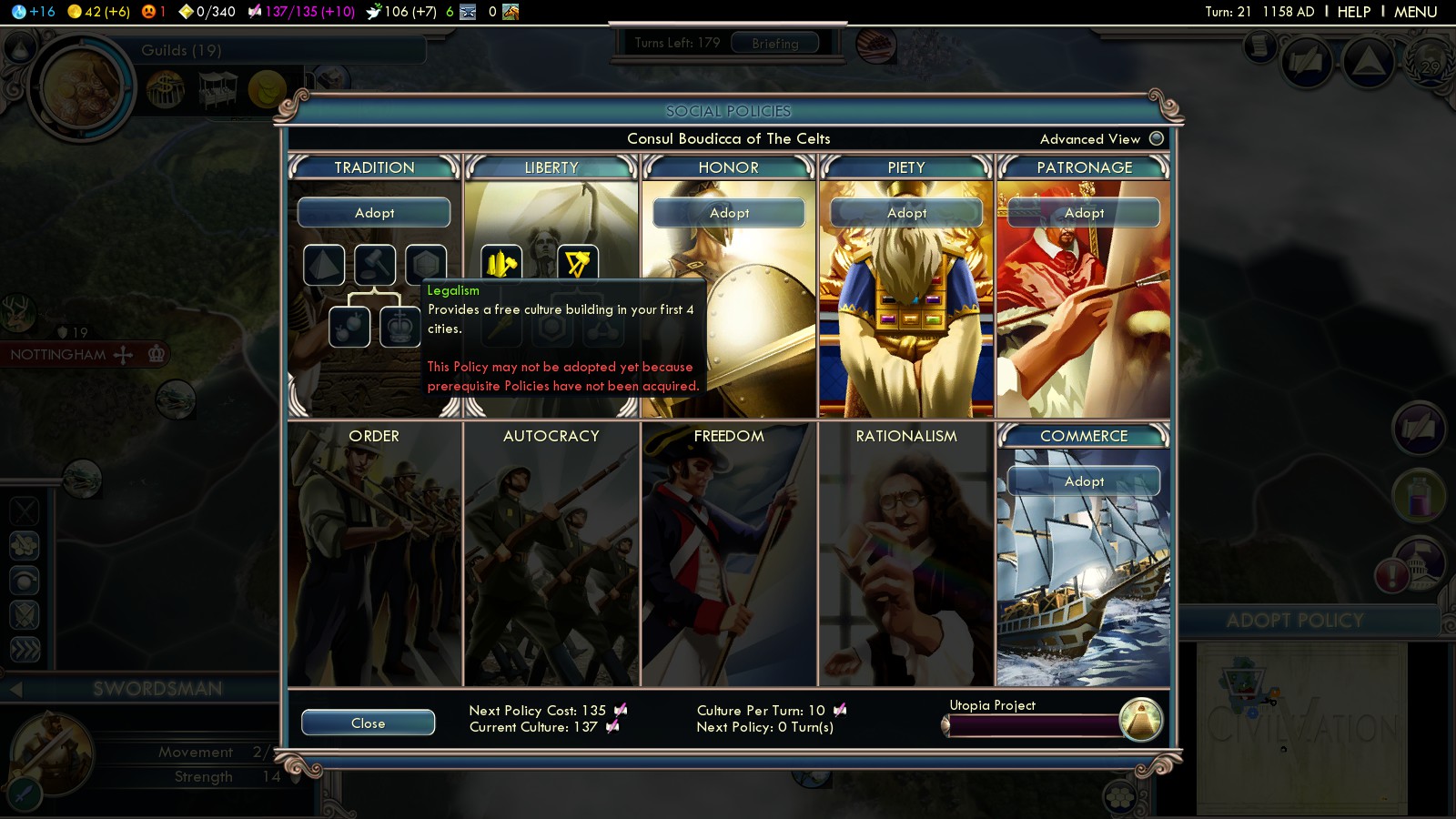 After that – stop with the Liberty tree! I adopted Tradition and went for Legalism (turn 35), giving my first 4 cities a free Amphitheater! This boosts your culture a lot, allowing you to adopt new Social Policies every 12th turn, instead of every 18th. Whenever a city better not grow anymore, due to your empires (un)happiness, use the specialist slot in the Amphitheater to produce more culture.