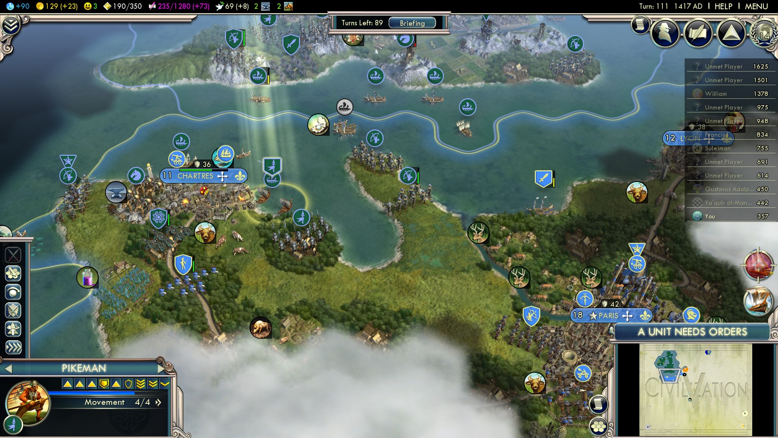Nottingham and York fell in turn 70 and 78. London in turn 83. I settled two cities on Ireland in turn 79 and 90. To keep the money flowing (getting Gold for kills from the completed Honor tree), I attacked France in turn 103. The first cities fell quickly. Paris in turn 142 even granting me VP, because they converted to Protestantism.