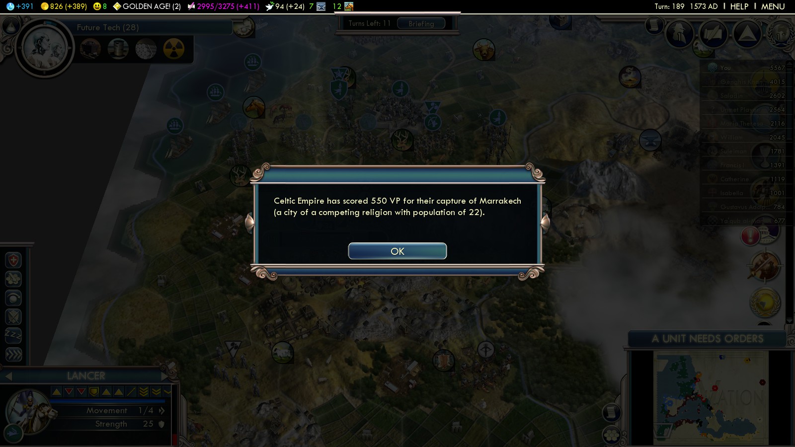On emperor, I had a fair amount of success just attacking England straight-away since they seem to send out at least one unprotected settler that you can steal and the pictish warriors are actually quite strong at the beginning. That’s probably too aggressive for deity, though. I actually managed to conquer England before getting longbows, which is a bit of a first-world problem since that made the ensuing invasion of Morocco a bit harder at first.