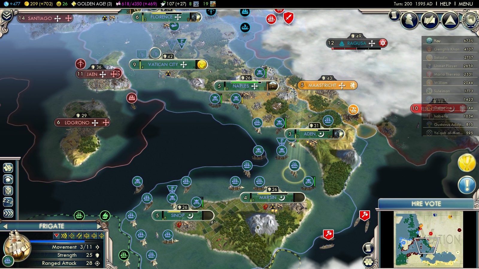 The overall 2550 VP from Dutch cities pushed my score in turn 200 to over 8000! My conquests in Northern Africa and the Netherlands made my empire the biggest of all nations in this game of “Into the Renaissance”.