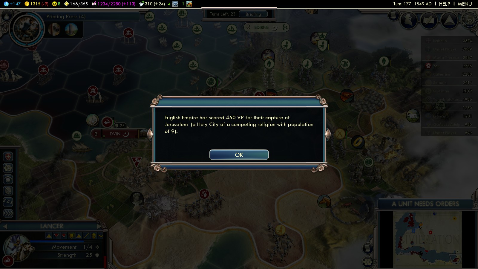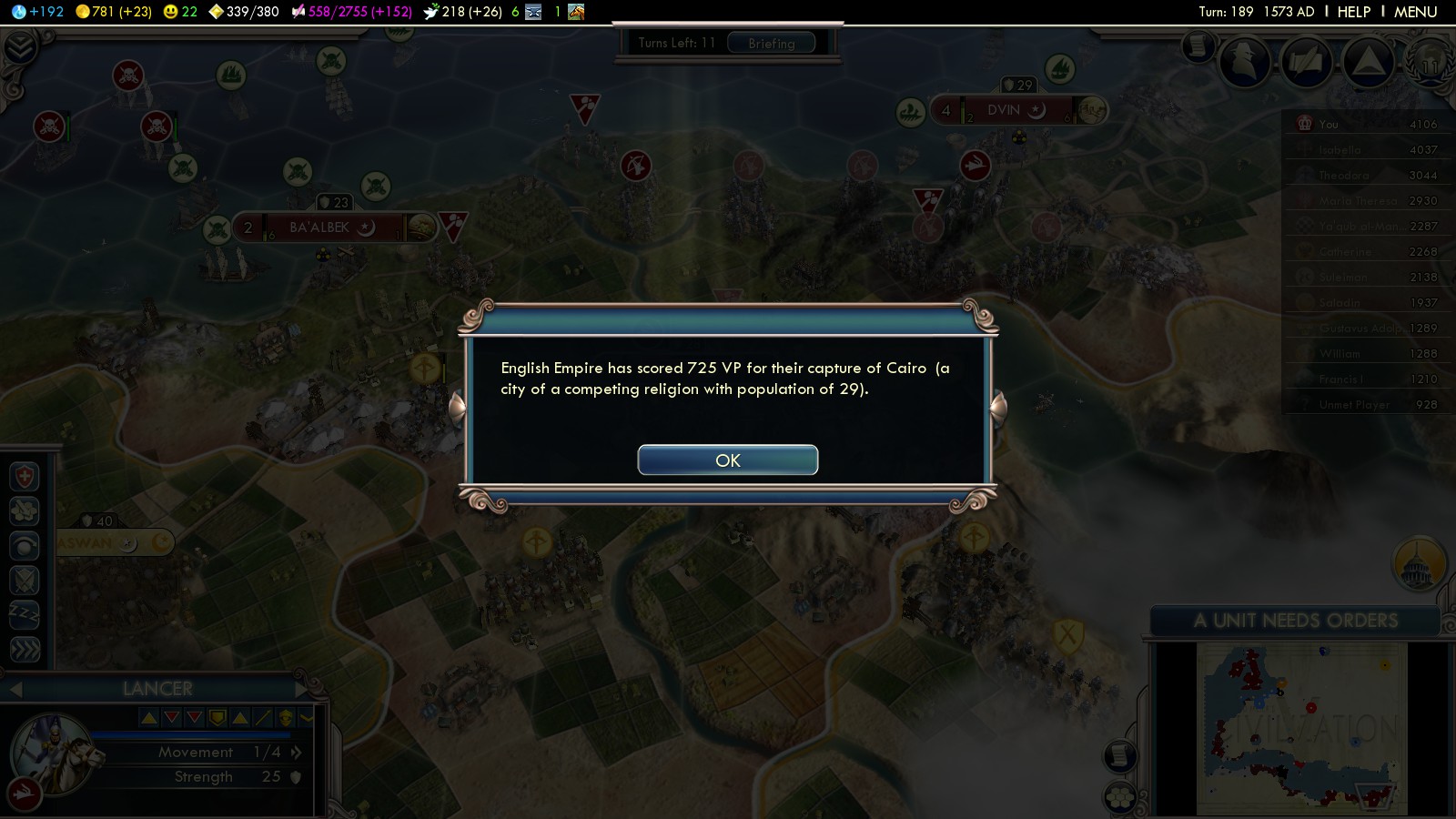 The way to win, of course, is to capture more Islamic cities. There’s plenty Ayyubid cities left. Several had already been captured during the Turkish-Ayyubid war. Have your growing fleet of Ships of the Line bombard them and capture them with your privateers. Once you have a foothold in an area, annex some cities and buy ground forces, preferably mounted units, so you can capture in-land cities.