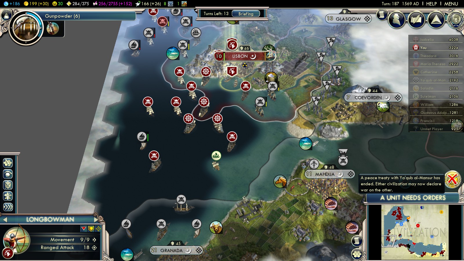 The ink on the peace treaty wasn’t dry yet, when all units, mostly veterans, embarked and sailed south to Lisbon. I don’t know whether it was a good idea to take it – I lost 1 or 2 Longbowmen, because there are not many places from where you can bombard Lisbon, without being fired on yourself. I mainly did it, because I thought having a resting point halfway between England and the holy land would be good. When I captured Lisbon in turn 138 it was an Islamic city of 16, granting 400 VP on capture. Longbowmen bombarded it down, a late Privateer captured it.