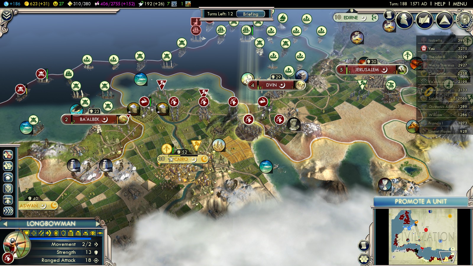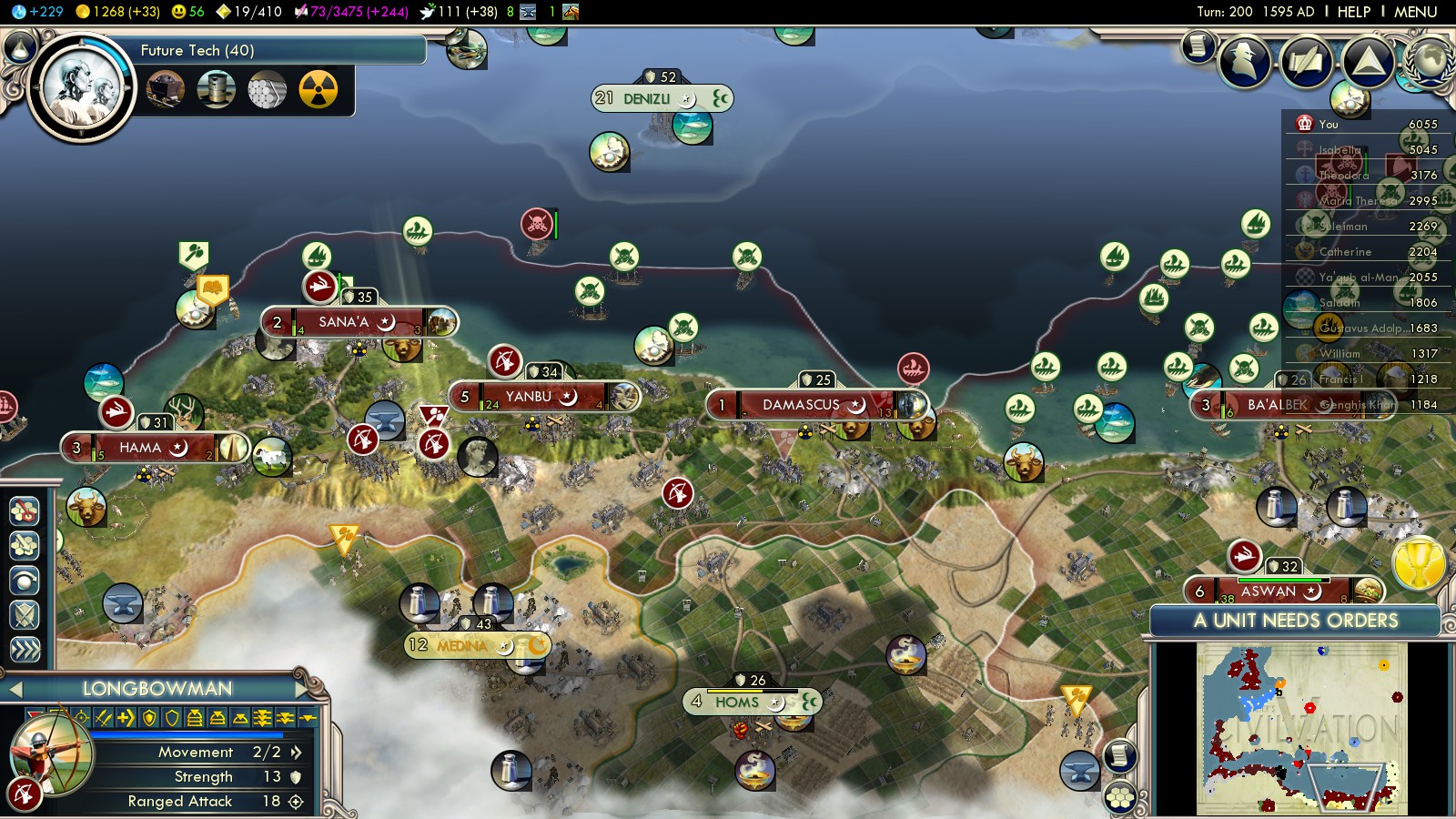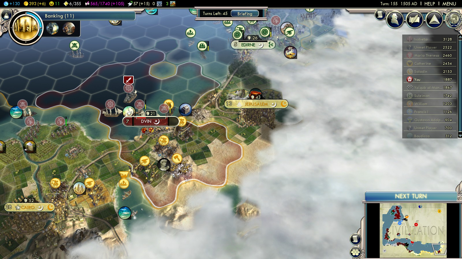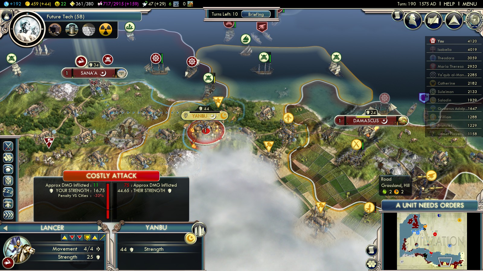 2. Why bother with the war? It gets you no VP because they’re the same religion as you, and it’s easy enough to buy those open borders. Plus, that’s not actually even a faster route. The terrain on this map is just nightmarish, and the French and Spanish build roads for their needs, not yours, meaning there’s no road straight through the continent. You’ll get where you’re going much more quickly (even aside from the part where you fight a war) if you just sail the “long” way around and arrive at Tunis that way.