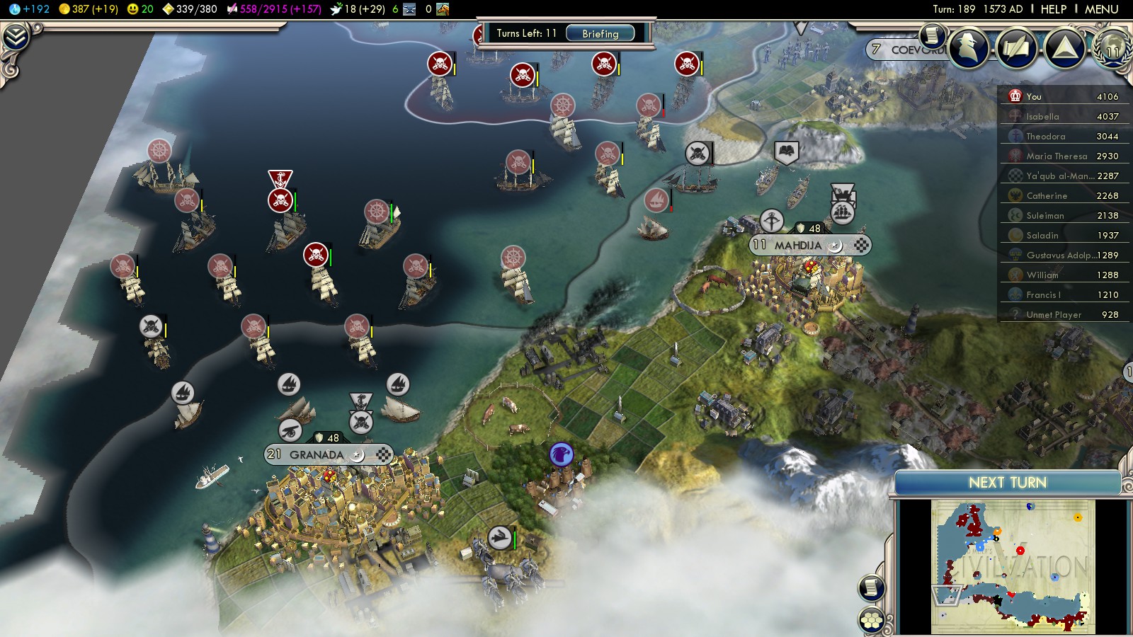 Granada was very straightforward. Mahdija and Fez were blocked by Spanish pirates, so I couldn’t attack those cities. The turn rotation was: Almohads -> Spain -> I. So the Almohads killed the Spanish pirate blocking the city, the Spanish replaced it with a new unit and I could never once attack them with my privateers. The solution was to buy Lancers in Lisbon, ship them over and attack the cities from behind.