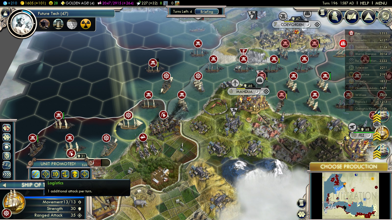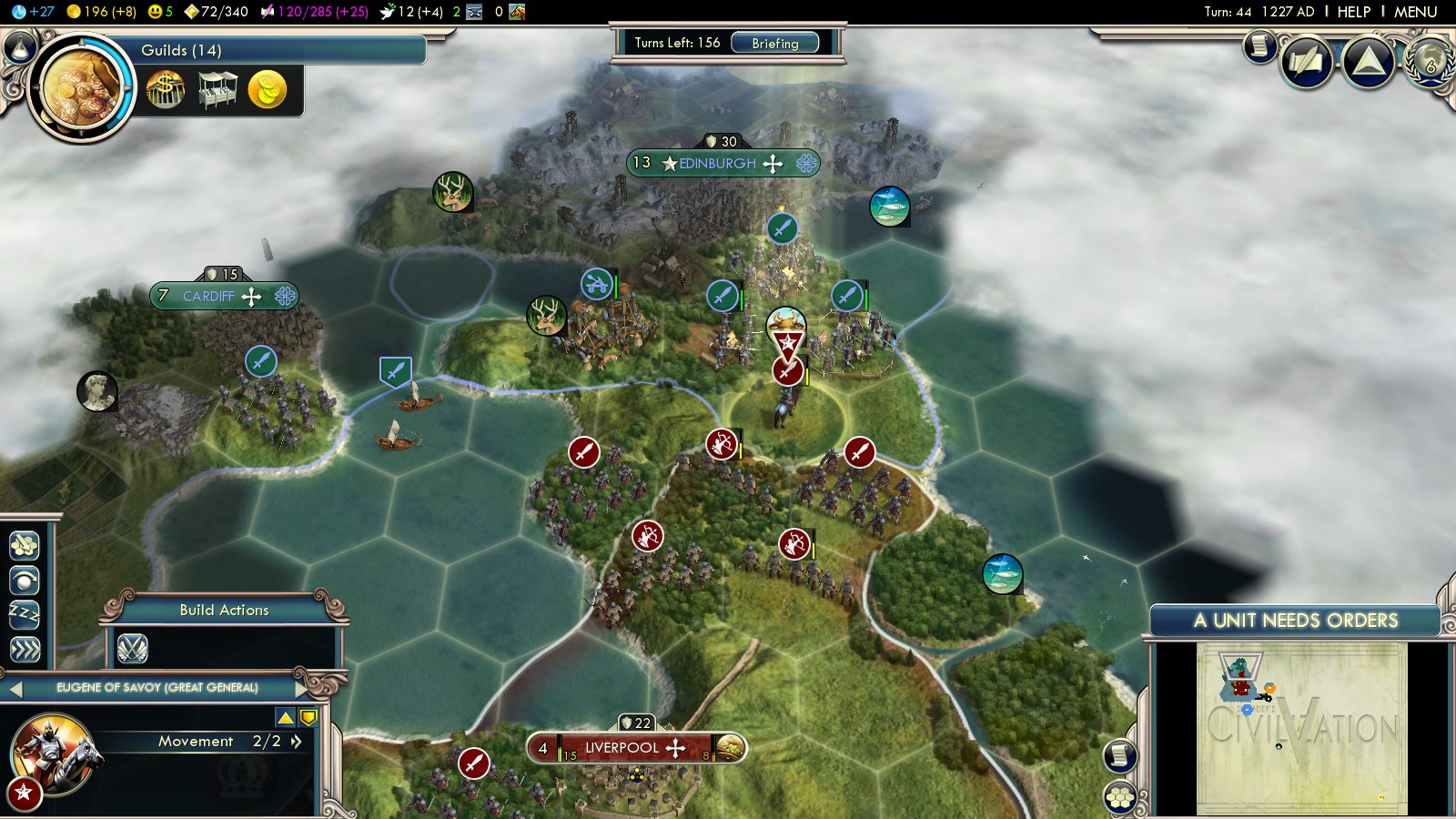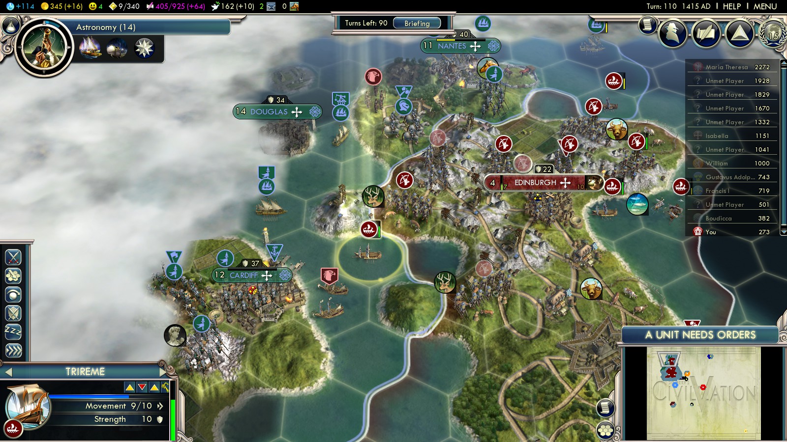 What do all your cities at home produce meanwhile? Well: They produce some units to finish the Celts and some ships to fight off the Netherlands (plus dozens of Longbowmen, protecting your coastal cities, mainly London and Edinburgh). A small fleet will be enough: The Netherlands can’t cross to your west coast, so about 10 ships are enough to defend at home.