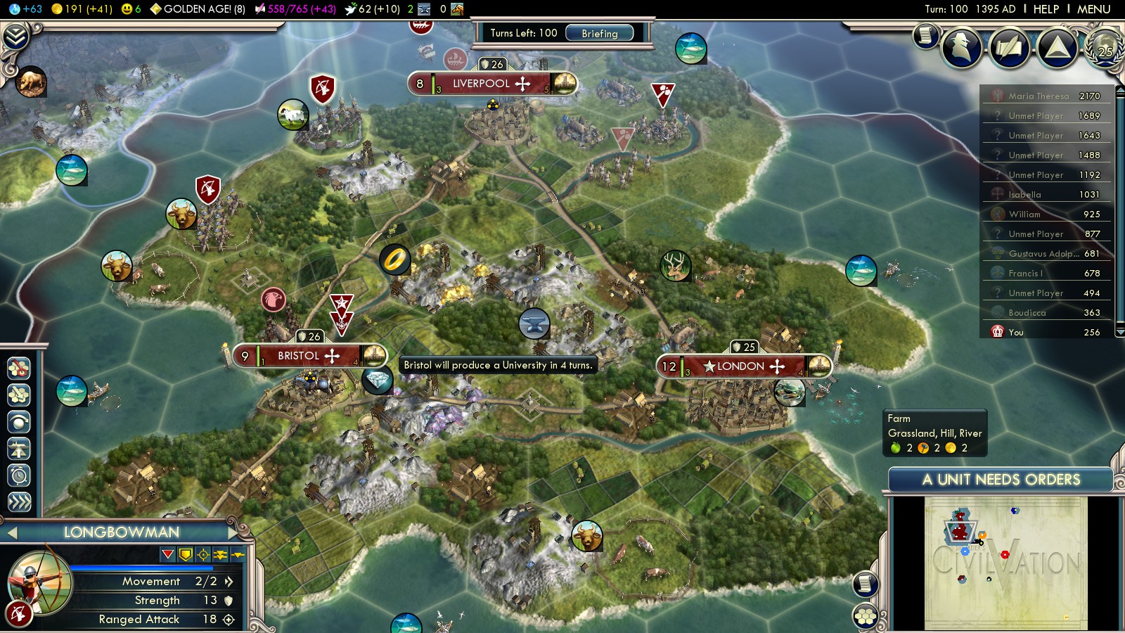 Found Bristol as quick as possible. There’s really no better spot, even though you might be unlucky with some nice resources at Land’s End. Ignore them. Bristol is the superior spot. Also because, together with Liverpool later, it’ll block all other places to found cities on Great Britain. Later you might leave one unit placed on Land’s End – otherwise the French or Dutch will found a city there!