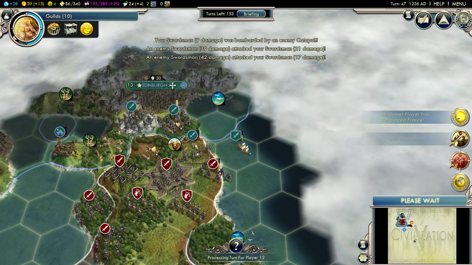 Following the usual tactics, building roads, fortifying and healing my units, shooting Celtic units with promoted Bowmen, I made my way to Edinburgh. From there: Always take out enemy units first, then fire on Edinburgh. I was able to take it in turn 86. After a bit of back and forth (which is good, as it decreases the city-size and thus is better for your happiness) I held the city from turn 89 onwards.