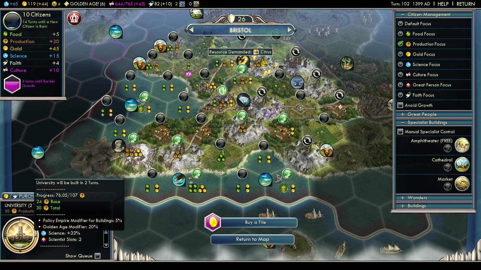 One more advice: Micromanage!!! See below: Bristol finishes University in two turns, but it’s only one or two missing production, to make it in one. In a case like this: Micromanage. Manually place all city tiles to be worked on, so you’ll get those missing production and make it in one turn! In a case like this, I’d even take a bit of starvation for a limited time.