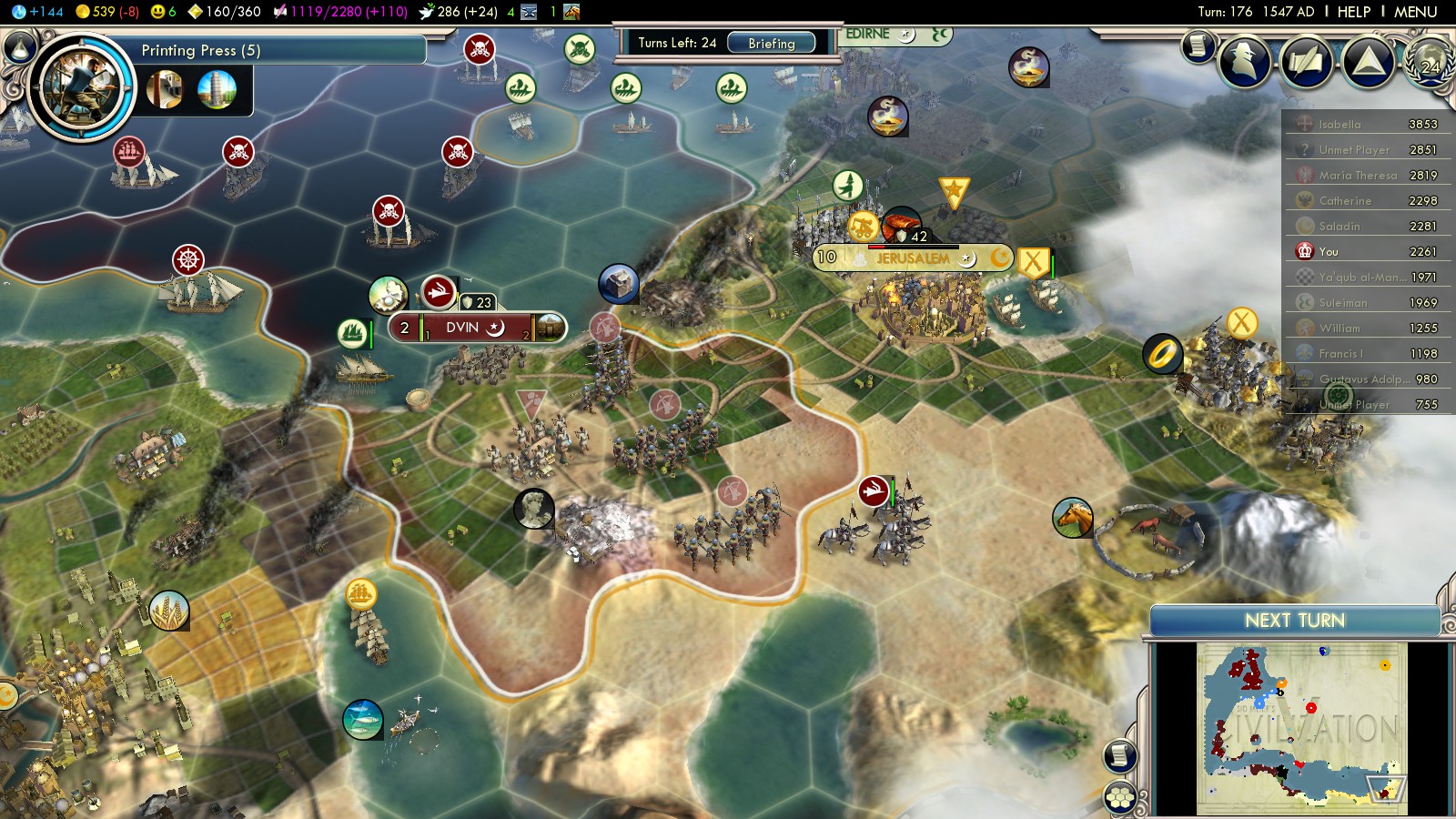 Somewhere through the game some of the Catholic nations all declared war on me. Sweden, the Netherlands, Austria. Spain and the Celts I had mentioned already. The (only) good thing about this: Suddenly the Turks and the Ayyubids love you! This is great, because no matter who of them holds Jerusalem: You’ll need the help of the other party in order to make it. In my game the Ayyubids held Jerusalem. Also, as usually, they controlled wide parts of Northern Africa, where they had built a huge fleet. Either way: Both of them will always have a strong navy. Bribe one into war against the other. Being a pirate is fun! Stay back as best as you can. Capture half-dead Privateers and make them your own! Slowly but surely, you’ll have a massive fleet of your own! Use it to capture cities (for VP), but don’t loose sight of your main goal: Jerusalem!