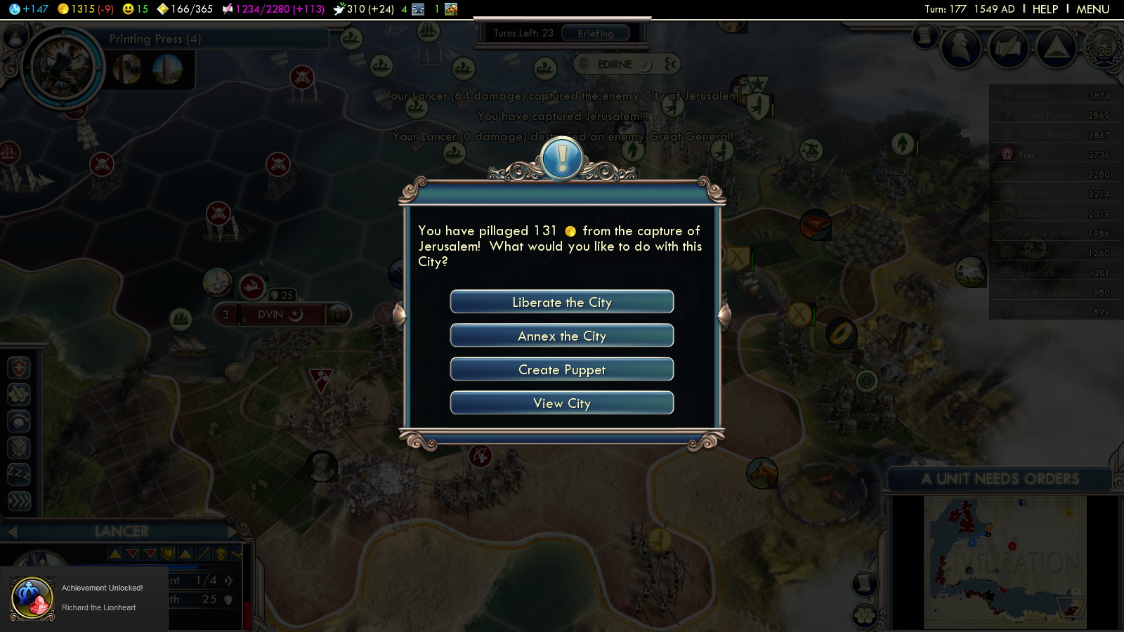 This will be highly situational: If the Ayyubids have a coastal city on Sinai, everything will be easier for you. Capture this city. Defend it as best as you can. Use your Ships of the Line to kill whatever the opponent brings to the battlefield. You’ll have the strategic advantage Sinai represents: All their units need to be funneled through 1-2 tiles and your Longbowmen have the range-advantage as well. Securing your position is the most important thing! In my game, the Turks were pressing on the Ayyubid cities in the holy land. So the only resistance I encountered came from the west. Once there are less units coming for you from that direction: Lay siege to Jerusalem! Capture it and the achievement is yours!