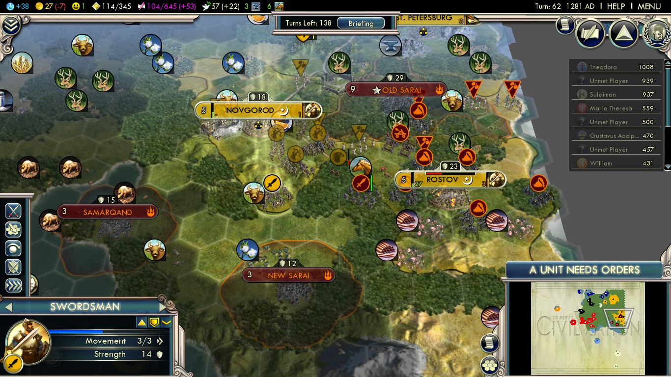 As I had to do so much fighting so early in the game, I had no time to build enough settlers to claim the land I wanted first, and I had to take it over. The Dutch (!) settled a few cities in modern-day Belarus and Ukraine; of course, the Dutch don’t belong there. I conquered his cities, which he couldn’t properly defend due to distance from the main part of his country (and we were BFFs ever after). Russia’s unique ability is plain awesome for that.