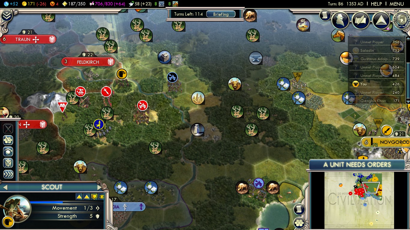 As for Russia… well you cant really build your first 4 cities up without units. Every city needs a Compbowman otherwise you will get pillaged 24/7.