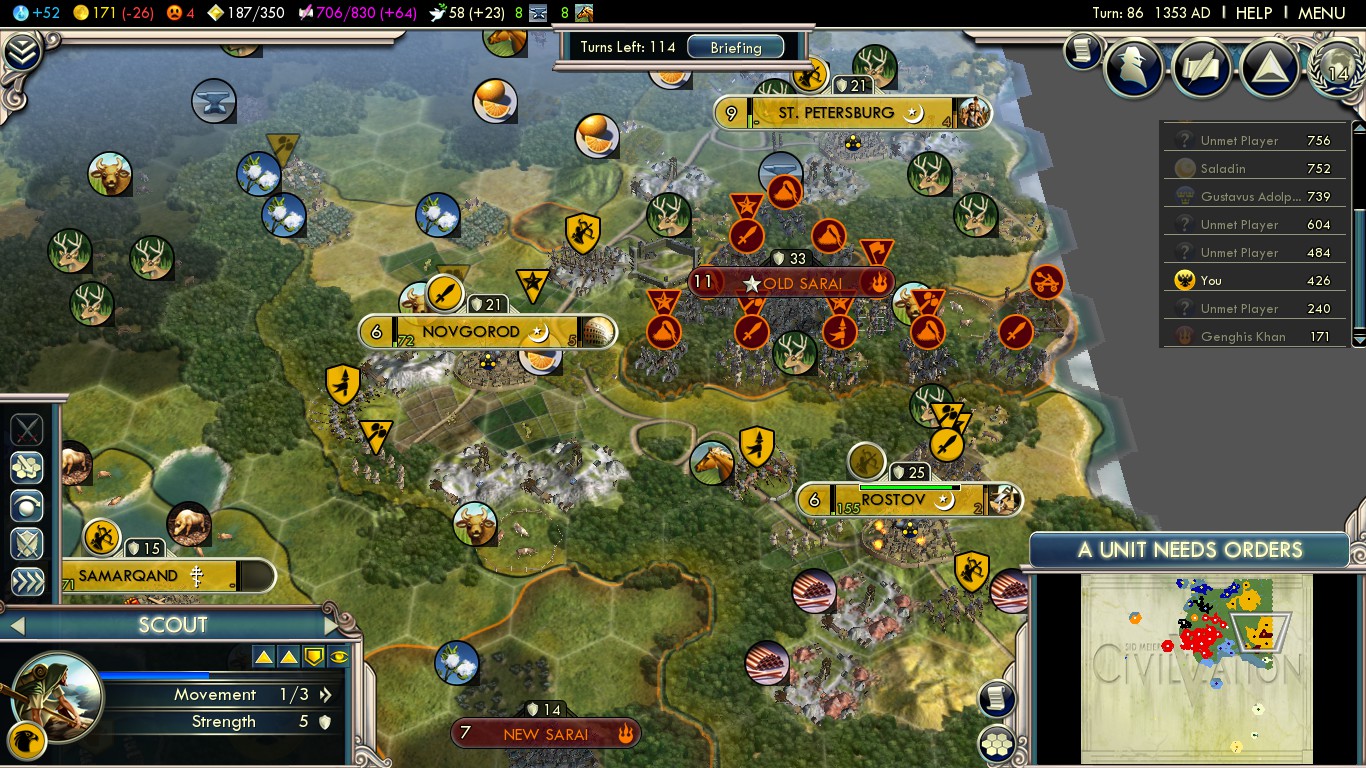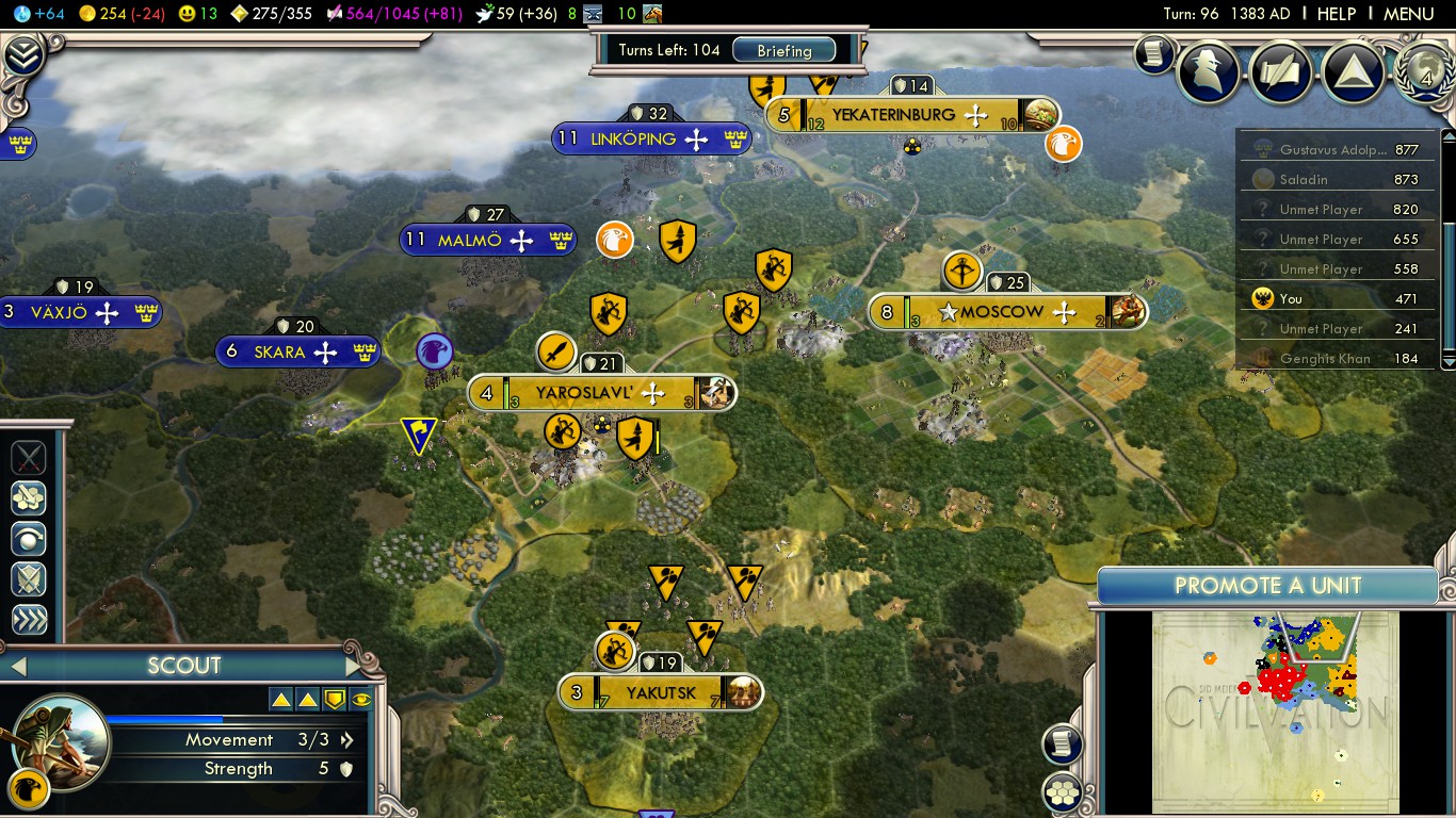 Robert, thank you very much for writing this guide! After it went live, I decided I’d want to try Yokes on the Mongols on Deity myself with that incredible approach on the Mongols of yours. I settled my three cities, blocking the Mongols. On turn 39, they spawned, and on turn 50 already, they declared war on me. The timing couldn’t have been better: I had some troops to defend myself and Genghis didn’t have too many troops in the limited space of his yet. I did want to intercept his settlers, but as so many went southwards, all guarded by units, I decided it was best to take over Old Sarai, which I succeeded at on turn 56. Then I learned why Genghis Khan doesn’t disappear after all cities of his are taken: this was exactly the case, but he still had settlers. He settled two more cities on the shore of the Black Sea on turn 59, which took me another 12 turns to conquer, and another coastal city just south of the Caucasus mountains on turn ~65. That was a great defensive position; luckily, Genghis had nowhere to expand to (he settled one more city, Tiflis, just north of Crimea; unfortunately, Swedish (!!!) troops were attacking me from there, and it took me a while to repeal that invasion to recreate the outcome of the famous battle of Poltava) and was eventually outteched and crushed.