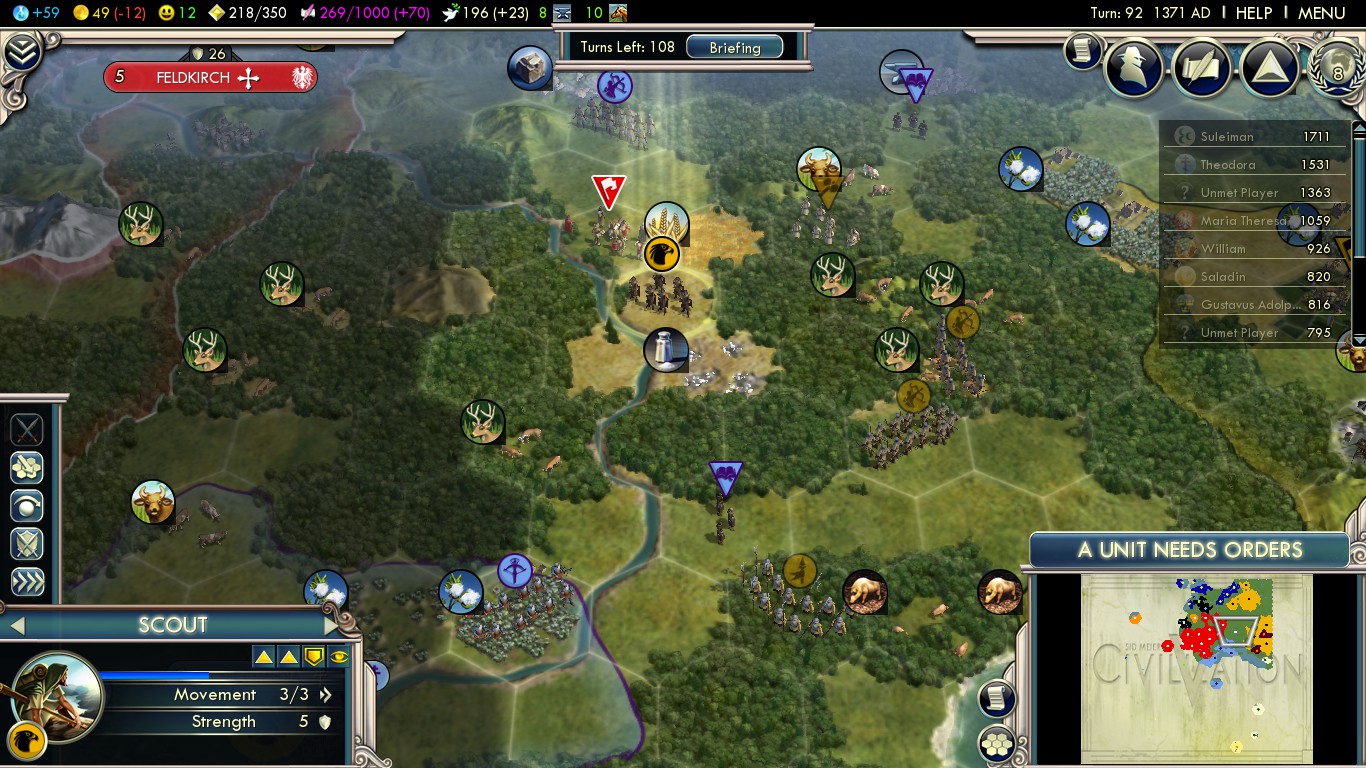 Austria will generally declare war shortly after discovering you, often with Sweden (if you haven’t already begun kidnapping his settlers). Fight off their initial wave while continuing to fully develop your main cities.