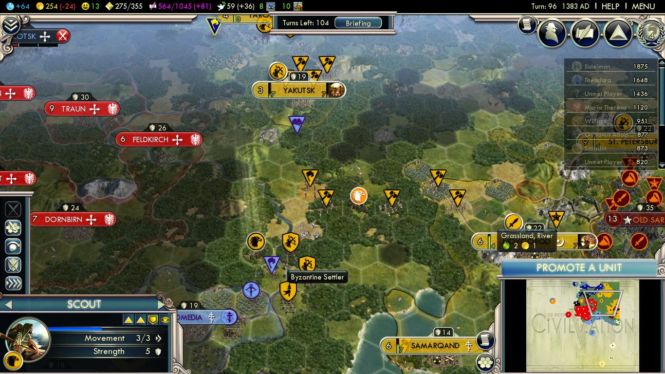 On the bigger picture I got really lucky in this game: The Ayyubids and Ottomans declared war on Byzantium in turn 83. In turn 122, shortly after the first Austrian offense ever (4 units), France declared war on them in turn 125 and they focused on that. Even though France and Austria made peace in turn 149, it still prevented them from amassing huge armies. The very moment I made peace with Sweden in turn 127 for 1.000G, I declared war on Mongolia.