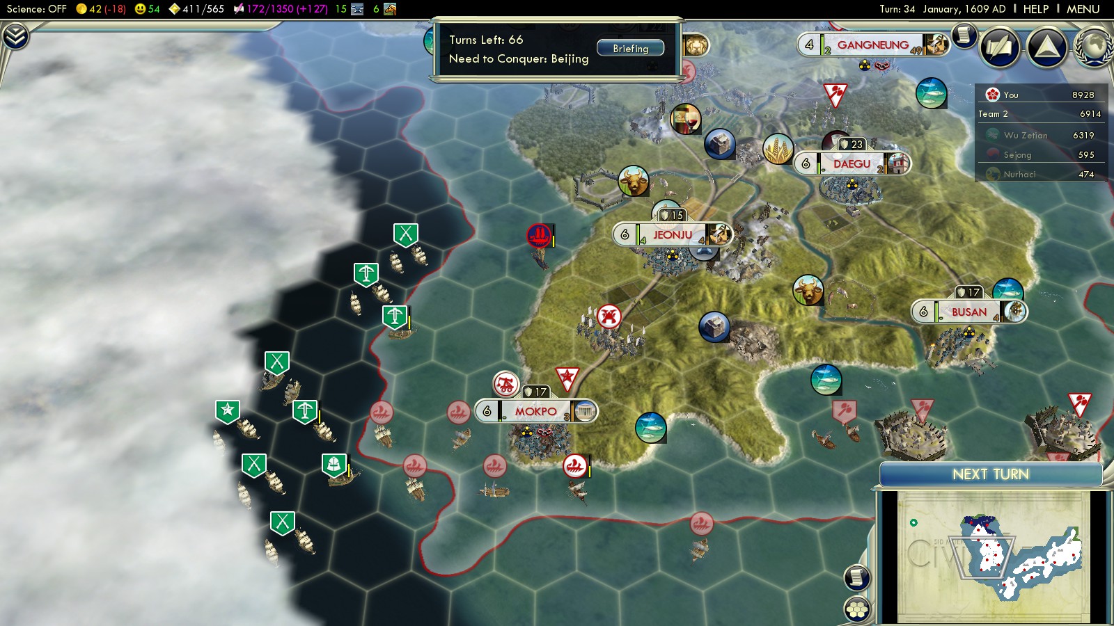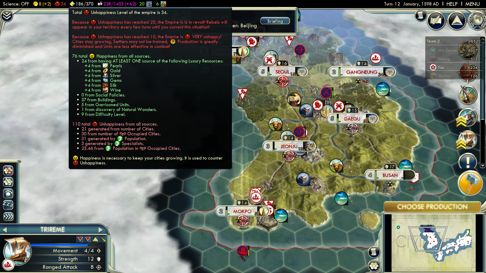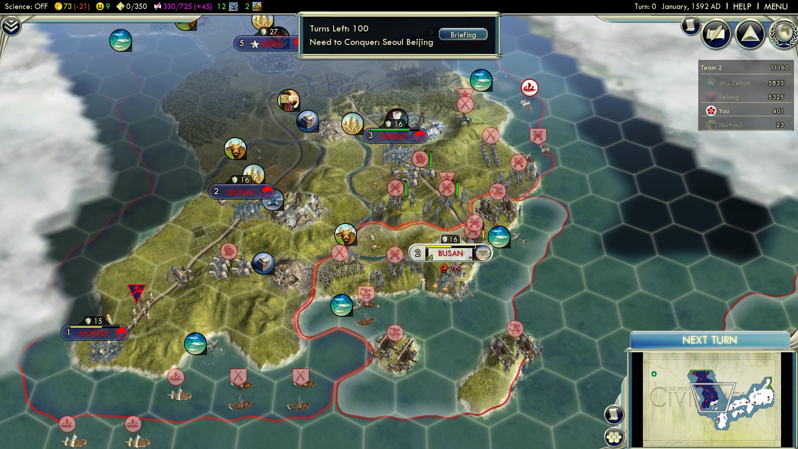 I played on Deity difficulty right away – especially after the overwhelming success in “Fear the Turtle” playing Korea. Use your initial army to capture Busan in turn 0. Bring units in place to attack Daegu as fast as possible. You’ll need it for its Silver, improving your Happiness, and the strategic value of the road through the hillside. Move your Triremes west to bomb Mokpo and also dispatch some units west to capture it later: