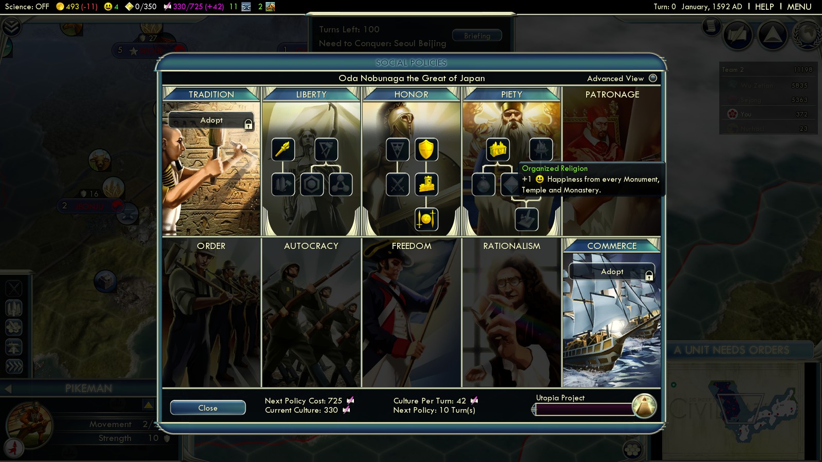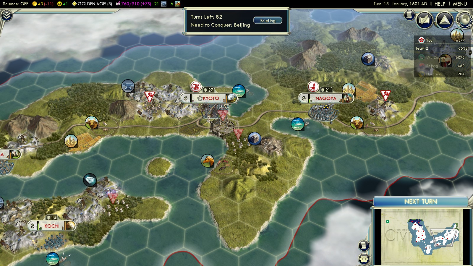 At this point of the game, Meritocracy is of little use, as your Korean cities won’t be connected to Kyoto until you manage to build a Harbor.