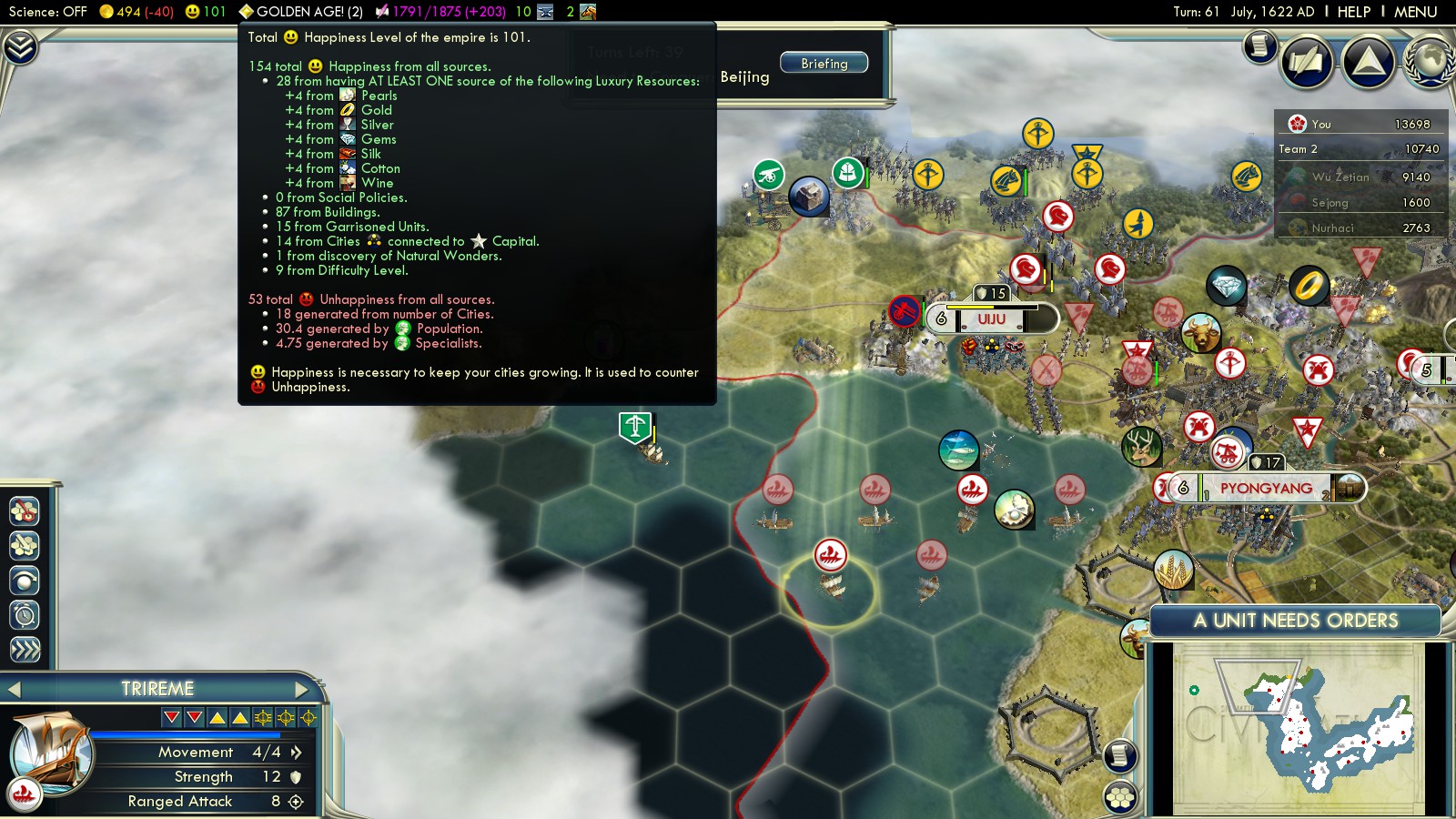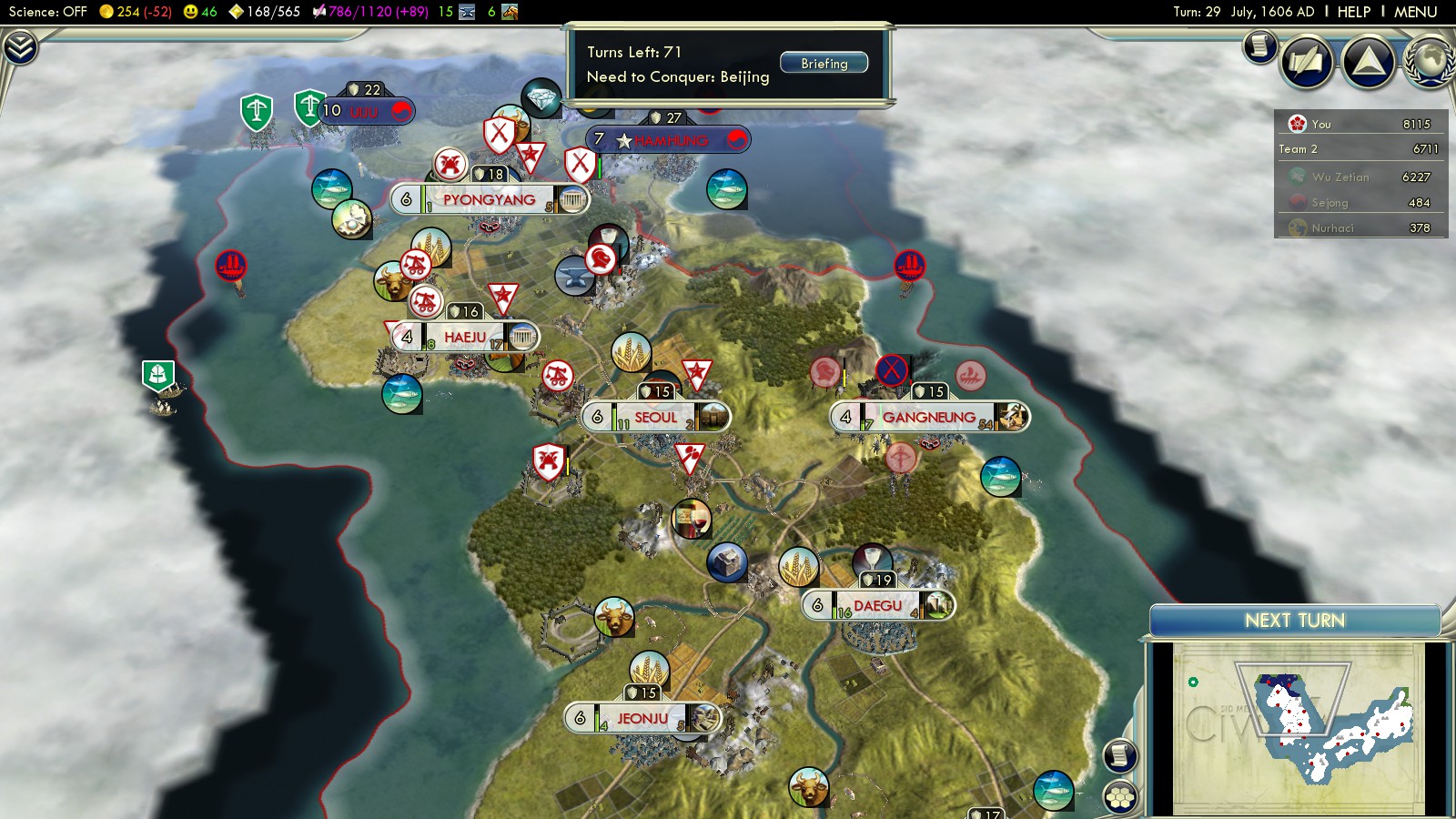Now while you go ahead and conquer Korea using almost only your initial troops, you’ll realize your Happiness rating stays unaffected by your captured cities. In the picture above you see a Happiness rating of 46! 🙂 🙂 🙂