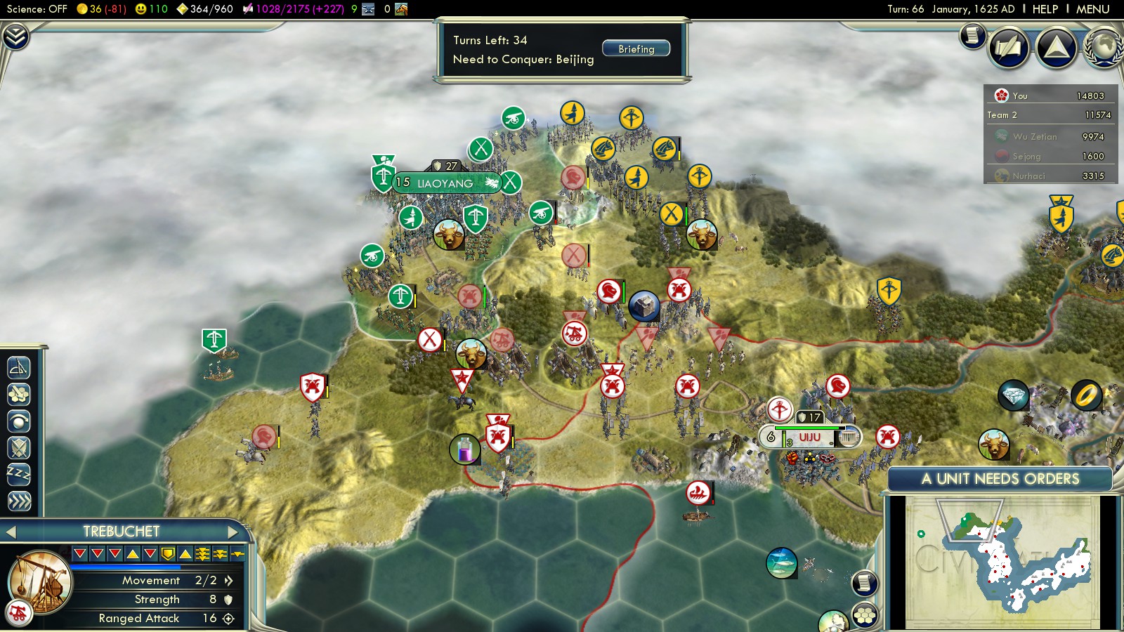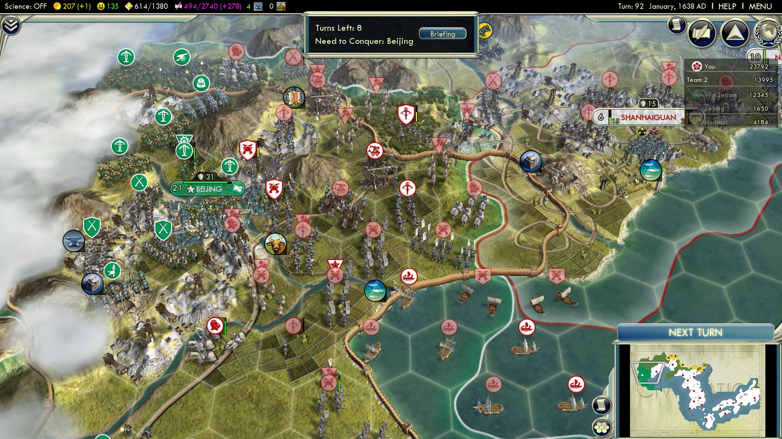 These are great guides for sure. The first time out, my computer crashed while I was a couple turns from taking Beiing, and the Manchus declared war, so I withdrew and just ran the clock since I was so ahead in score. Yeah, attacking when you have a happiness of -234 and -33% on combat strength was tough given the number of cannons dug in around Beijing. The second time round for conquering Beiing, I actually decided to conquer Weifang first, since it’s lightly defended. That gave me a base to harass Jinan to block reinforcements and swarm the plain SE of Beijing with cross bows. With the supply of Cho-ko-nu and cannons cut off, Beijing had no chance. Turns out Jinan fell the same turn, and the Manchus declared again. Good times, but that one was in the book.