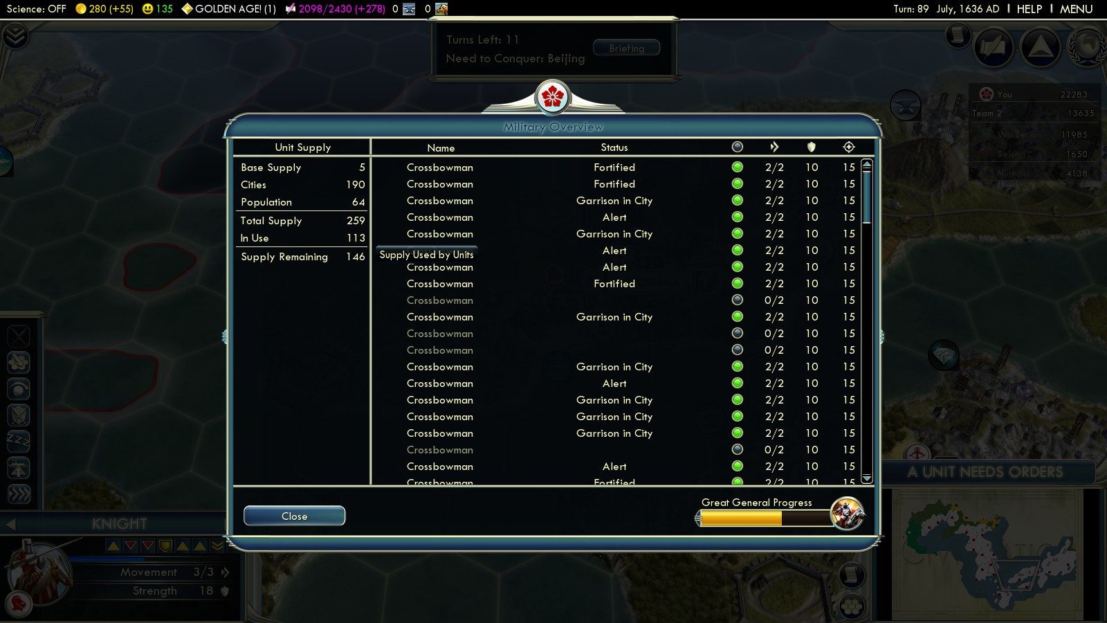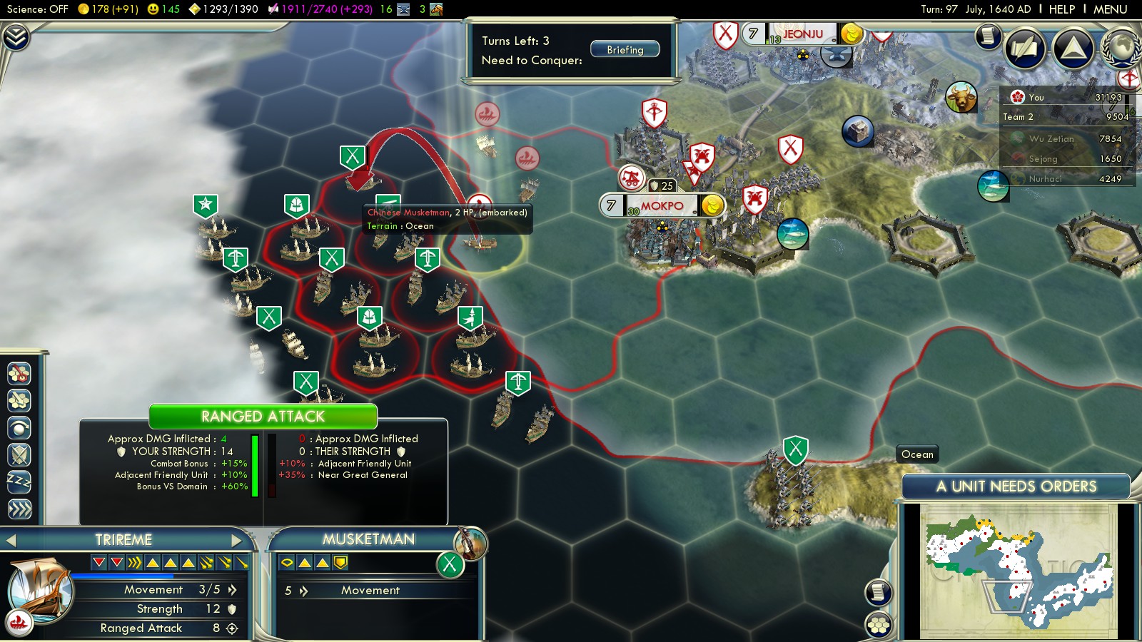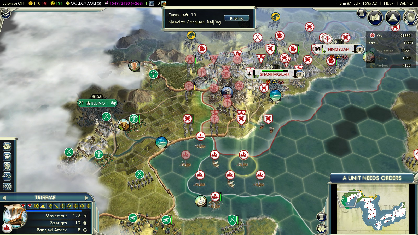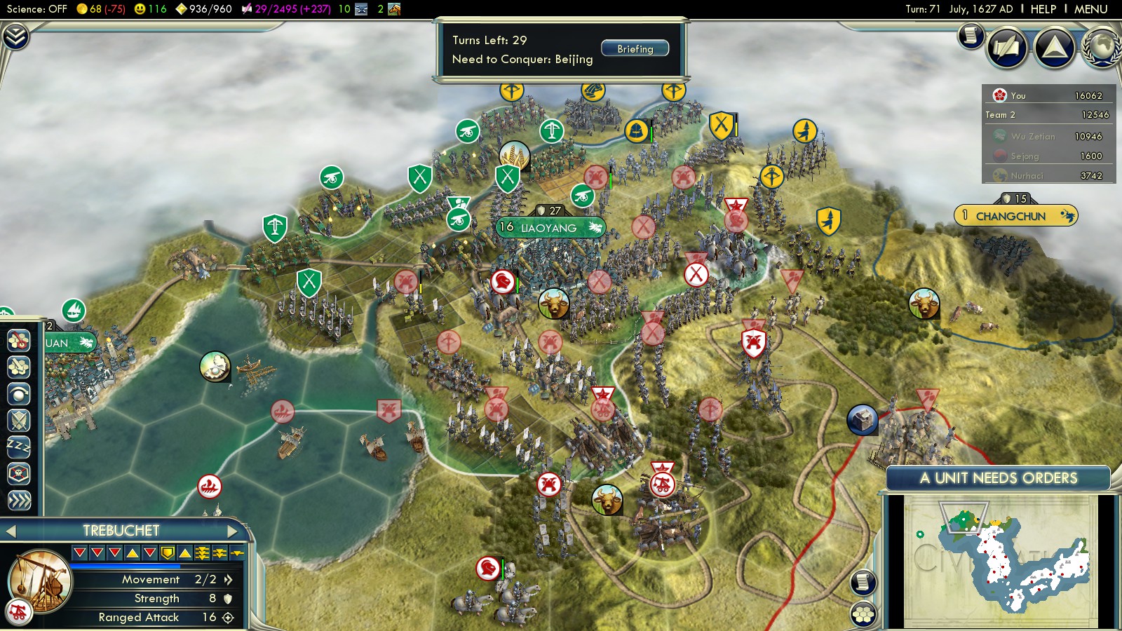 Just finished a game on Deity where I was able to sweep through Korea quite quickly (Pyonyang by turn 15) and get all 3 Chinese coastal cities by turn 44, before the massive waves came. They seemed to waste most of their troops across the sea, where they got wiped by my growing navy. I had a strange bug where the righteous army caused Korea to recapture Seoul. I had no unit there, and somehow a righteous army unit got placed in there and it reverted to Korean ownership with no battle. I recaptured it right away, but it was odd. I got to Beijing early on, by about turn 50, but I had no long-ranged artillery units, and the Manchu declared on me. So, my Beijing troops stalled, and I had to waste time countering the Manchu invasion. I stopped them by capturing a Manchu city and putting a citadel in front, which broke wave after wave of them. I had trouble countering all the reinforcements coming up from the Chinese south, so I invaded on the coast and eventually cut the road. At the same time, I built a road running north of China and slowly trickled troops around behind Beijing. These eventually broke through and allowed me to engage Chinese reinforcements south of Beijing. I also invaded the peninsula, which drew a lot of Chinese troops away from the Beijing reinforcement train. The navy achieved veteran status and helped immensely with dispatching Chinese troops on the mainland without damage. Ships aren’t affected by the great wall, and can rain fire from 3 hexes, eventually 2x per turn. After I finally defeated all the Chinese troops surrounding Beijing, I was able to capture it in turn 80. Still plenty of time.