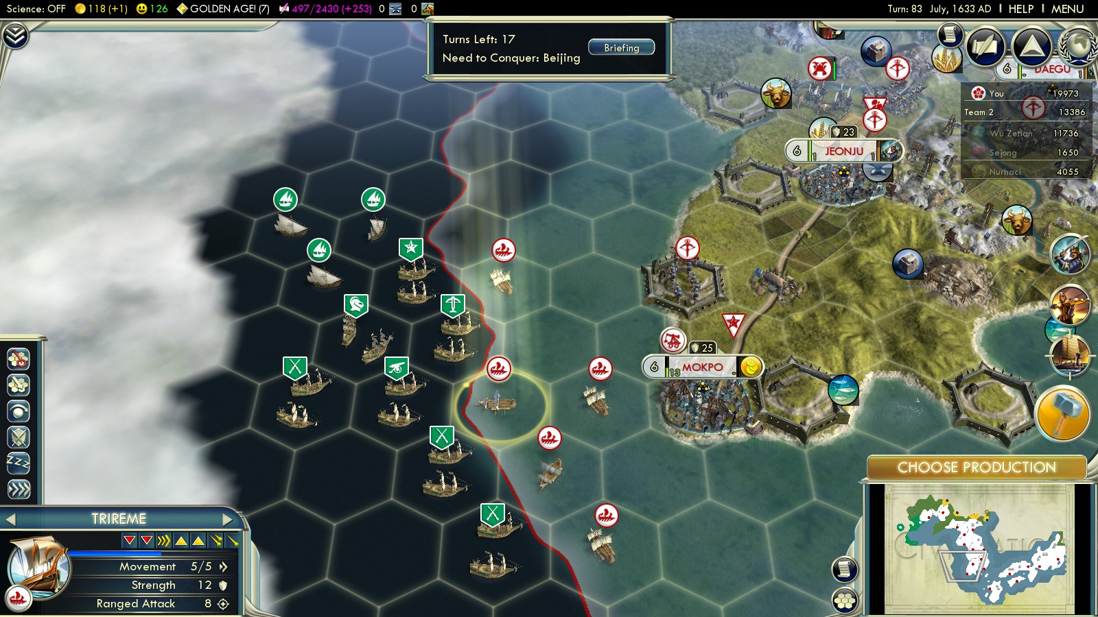 The Chinese don’t only come for you by land – they’ll also send huge waves of units (9-12 units!!!) to you across the Yellow Sea. Deal with those around Mokpo – have some Triremes ready and always some land units to fight off the Chinese.