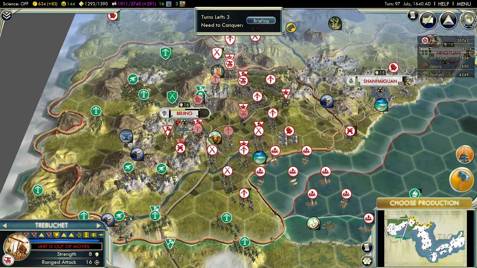By this time, if you did a good job protecting your veterans, you should have several veteran Crossbowmen (Logistics and Range) and ideally also 1-2 veteran Trebuchets. Bring them in place and bomb Beijing while your melees fight the Chinese reinforcements coming from their heartland in the south.