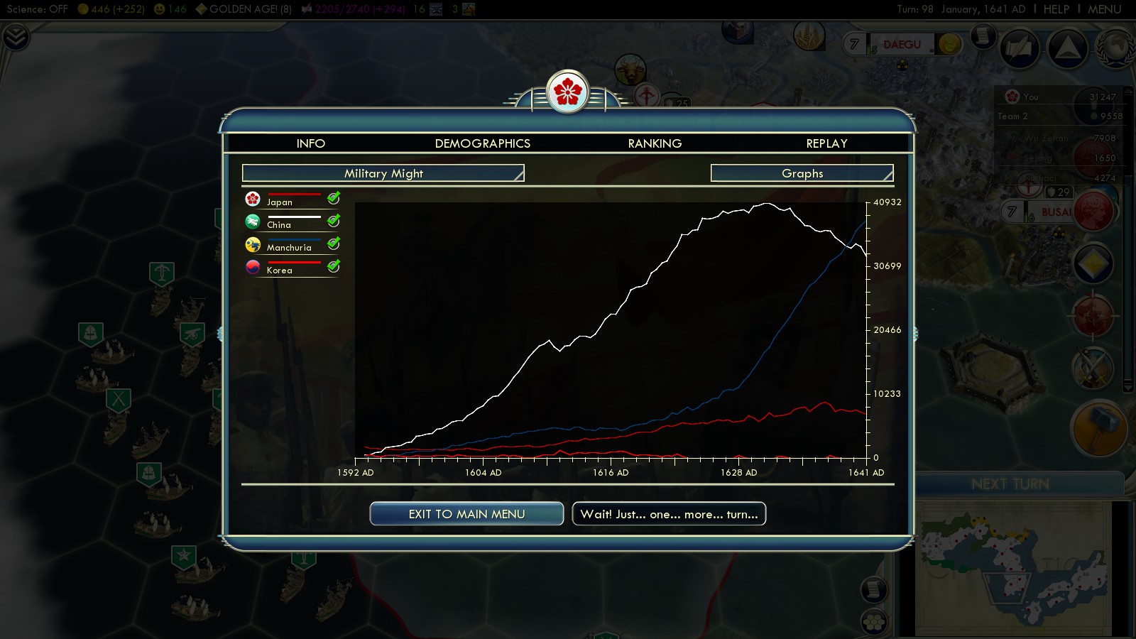 Once Beijing falls you win the game. China kept sending huge waves of units to Korea, so better keep the Mokpo garrison and fleet there, to not have them interrupt your supply line. The demographics are quite impressive. The huge Chinese and Manchu military explains why there’s almost nothing happening, when these two are at war. Also it’s impressive evidence, that playing the Samurai Invasion of Korea as Japan you should better not mess with the Manchu.