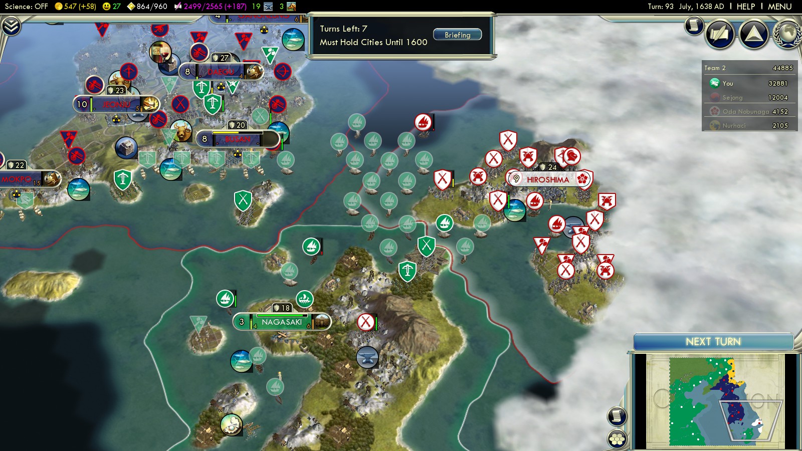 Where the scenario is titled “Samurai Invasion of Korea” it might as well be called “Manchu Invasion of China”. The Manchu, played by the AI grow stronger with every turn. Around turn 50 they will have a number of cities to match yours, they will have a strong military and can match your productivity. You have to attack before they shift this balance.