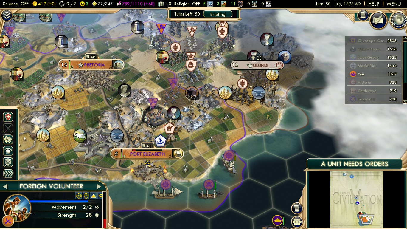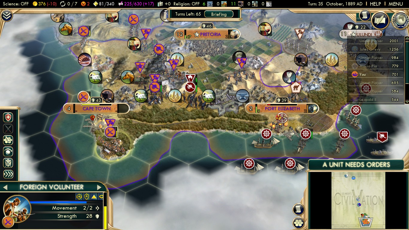 An edit. I started a new game yesterday with this, and I’ve been holding on (turn 47-50, but heavy save-reloading with privateers.) The map was favorable – river hills for Bloemfontein, coal and iron, flat Pretoria with four unique luxuries in range plus a small mountain range between it and Ulundi. The AIs, though… everything this map isn’t. Instant denouncements from everyone. Portugal and Germany DOWed on turn 4 despite me trying to butter up Maria with free luxuries and bribing the Zulus against her, and I had to pick Germany. (The Zulus took a Portuguese city! I’ll even forgive Cetshwayo for stealing Pretoria’s marble.) England put up fiercer resistance in this game than they did in the other, and they chopped forests at the coast, meaning I had to constantly rotate units in the citadel. Captured Cape Town around 33, but then the Germans started getting restless, and… well…
