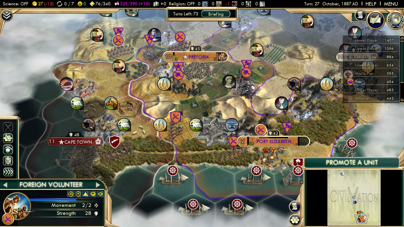 This war has been brutal. There was a heart-stopping moment that turned hilarious when Portugal immediately covered Bloemfontein with a carpet… of Explorers. Their suiciding on my Foreign Volunteers ended up healing my units; imagine that. But they’ve since brought in artillery backup and a pretty terrifying fleet to Cape Town. Meanwhile, the Germans still refuse peace and are marching on Pretoria. I just don’t have the units to handle them there, and my only possible saving grace is that they didn’t bring artillery. Every one of my cities is under assault, and it’s requiring some careful management to come through this. I would be absolutely screwed if the AI wasn’t so stupid: the German units could easily capture Cape Town or Port Elizabeth, both under constant frigate fire, if they weren’t lured to the otherwise unbesieged capital.