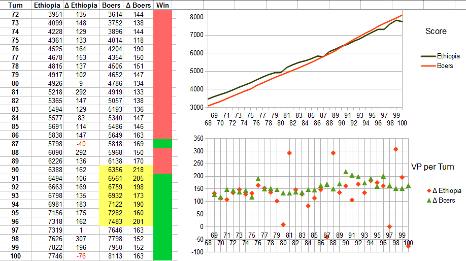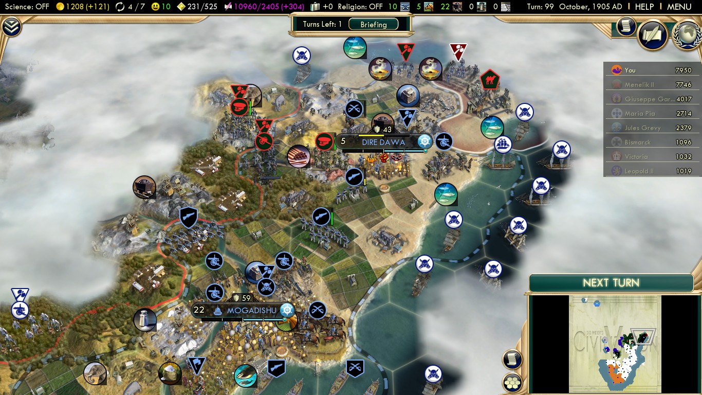 In the end Mogadishu (!!!) captured an Ethiopian city, sealing my victory. Had that not happened all those 100 turns and certainly more than 8 hours of playing the Scramble for Africa scenario would have been wasted…