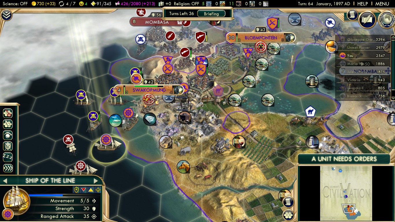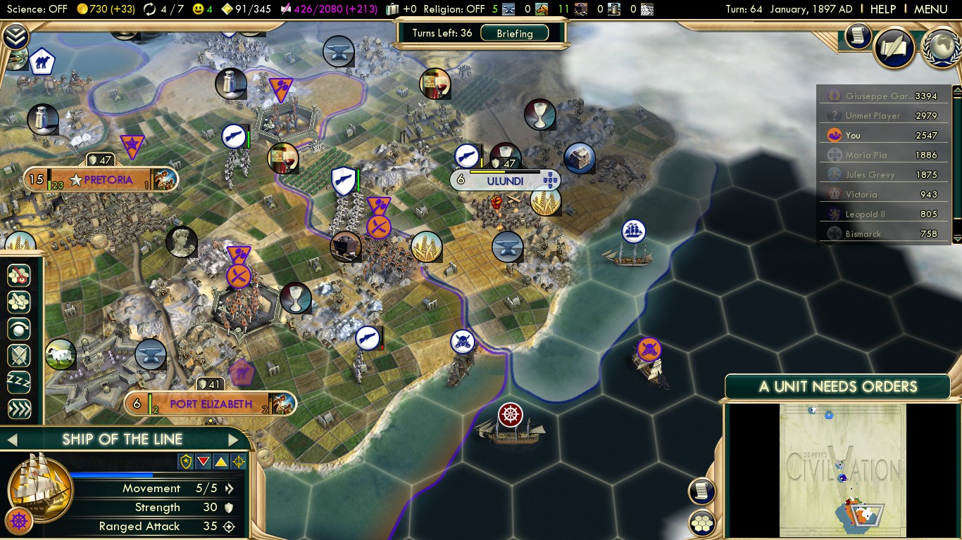 My two cents for this scenario is: once you capture Port Elizabeth, annex it and build a privateer. Its strong production tiles will give you one before you’re done with England. Use it to capture one or two Ships of the Line still besieging the city. Ship kills are worth a lot of culture, and this game is going to throw a lot of ships at you. Also, if you find yourself at war with Germany post-England, get their Brandenburg Classes. They’re almost as tanky as your UU, and murderously strong to boot. I wouldn’t advise outright picking a war with Germany unless you’re desperate for culture, but it’s probably going to happen eventually, so take advantage of what they’ve got.