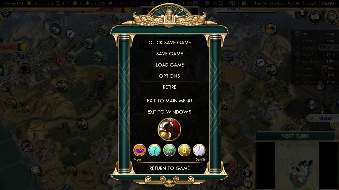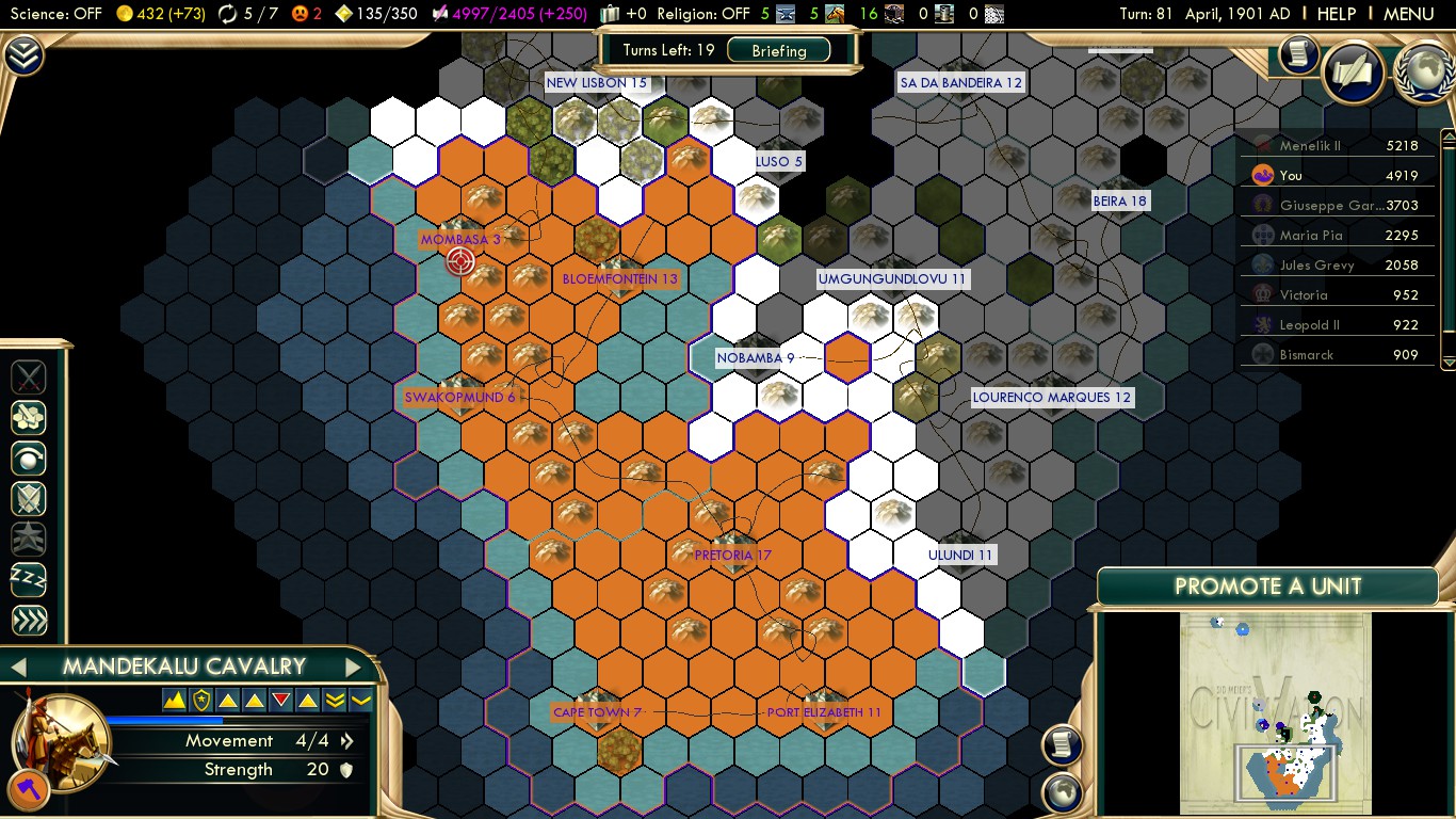 If you survive the first 20 turns and established your base, Praise the Victories is big fun and really straight forward: You have it in your hands to become a culturally dominant South Africa, repulsing the British Empire.