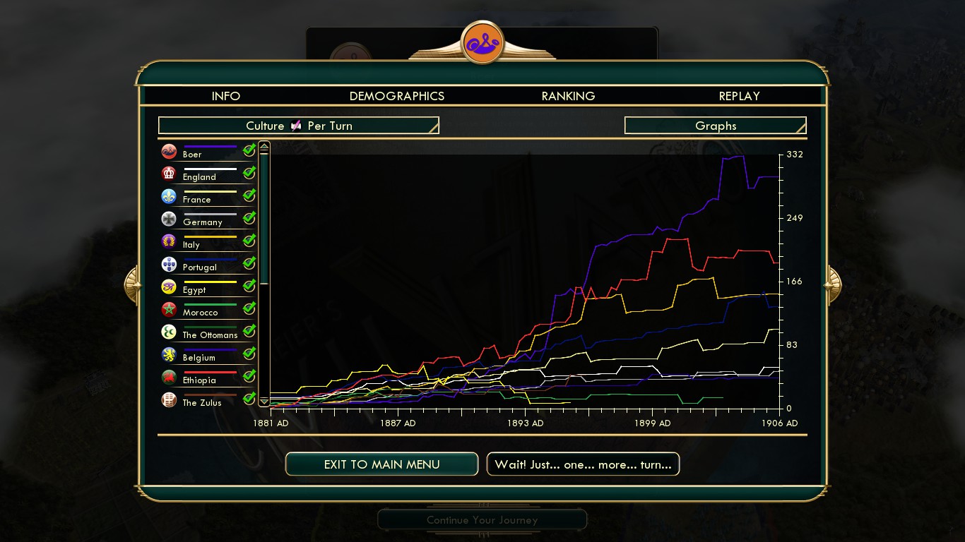 Skip to the end, Ethiopia was ahead of me the whole time and I was slowly gaining ground, when Italy and France declared war on Ethiopia and I panicked because I knew Ethiopia was poised to gain a ton of culture from these wars. I initiated war with Italy and France myself and was now in a 5 way war, and I let their fleets meet my defenses in Swakopmund and Port Elizabeth. I racked up a lot of culture kills every turn, saved my last great artist to pop a Golden Age on turn 94 when it became available, and popped my last great writer on turn 99. Final score 7820, Ethiopia 6826. I was really worried Portugal was going to declare war on me, but after turn 90 I was feeling confident. Italy also slowed Ethiopia by taking one of their outlier cities on turn 90. Feels great to finally take down such a brutal achievement, guess it’s on to the last tough one, Ottoman Carpentry. Anyway, just wanted to show that the strategies shared on this site are solid, did this without a special save map and first attempt after studying.
