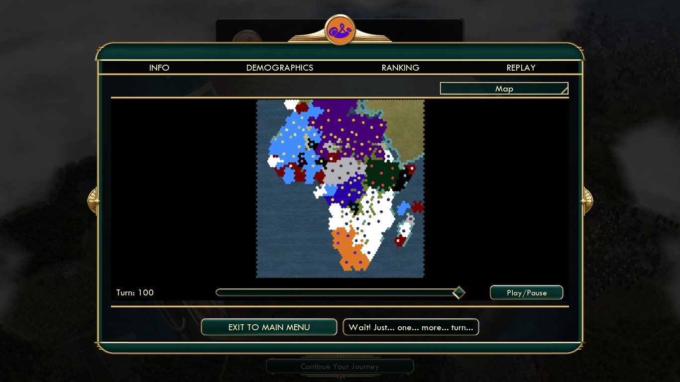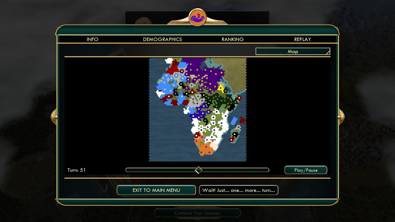 I’ve come to admit defeat – war with the Portuguese just isn’t doable. Perhaps with heavy naval save-reloading, citadels, a small border, and nobody else at war with you, it could work, but their production is just too strong to compete with. At the same time – I’d have never won this game without the oodles of culture earned from brutal, bloody wars. The fleet I created proved invaluable for catching up with Ethiopia – in the end, I surpassed them cleanly, 8173 to 6821.