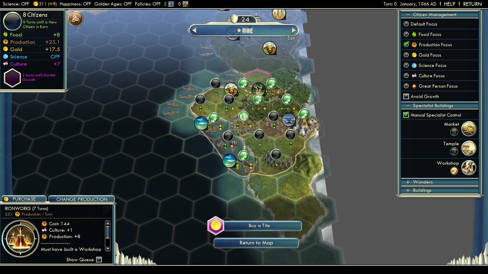 | 1. Ironworks (6 turns, maximize production, buy the hill tile and a Watermill and employ and engineer) | 1. Stable (4 turns, maximize production, employ an engineer) | 1. Worker (7 turns, set to growth focus, employ an engineer) |
