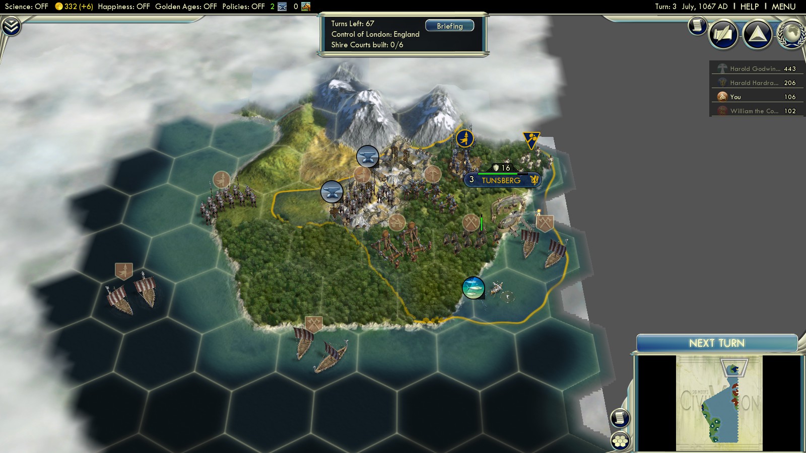 In my first attempt I was very eager to conquer Norway before turning towards England – a fatal mistake! By capturing Norway Iron supply city, I weakened their army in England. Without conquering any English city myself early on, the Anglo-Saxons were able to build all required Domesday Shire Courts very early and had won the game in turn 15!