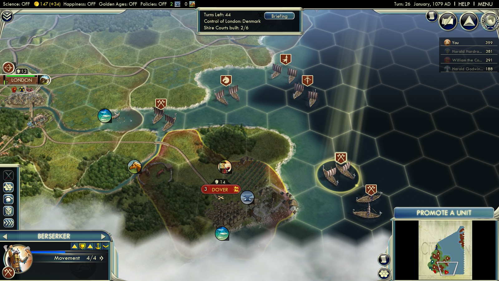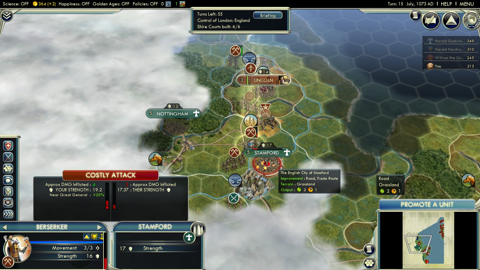 Split your troops. Take a look at the screenshot of the battle of Lincoln and Stamford – take 3 Berserks, 1 Crossbowman, 1 Archer and 1 Catapult to the midlands. Take the Great General, too. The rest will be sent to east England. Time is of the essence, as even with this strategy England will be able to build the required 6 Domesday Shire Courts!Ignore Dover! AI-Denmark always captures it early on, but you’ll leave it to William the Conqueror for now. - Turn 4 – Normandy captures Wareham