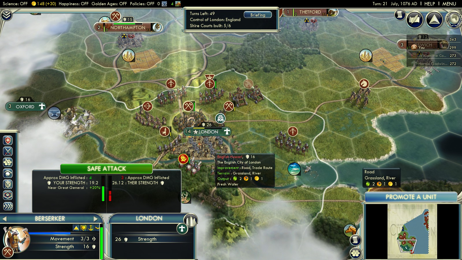 With your armies united turn on London. Keep an eye on the Domesday Shire count though: If England has only 5/6 – focus on your defense, so you not lose a city to Norway or worse, to England again. If they already have built 6, you can be 100% sure London is working on the Domesday Book.I rather bring in my troops from Northampton than from east England, as they don’t have to cross the river – makes me more flexible also with intercepting potential English reinforcements from the west. Having suffered little to no losses so far and attacking in full force, London can’t resist long.